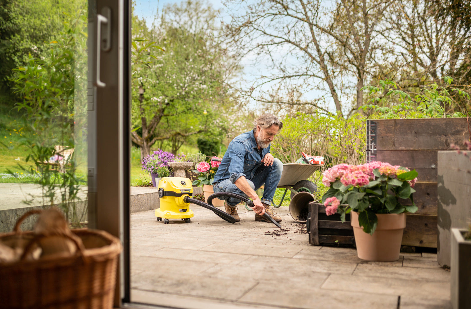 - Nettoyage flexible : l'aspirateur eau et poussière WD 2-18 de Kärcher peut être utilisé là où il n'y a pas de prise de courant. Il est facile à transporter grâce à sa poignée de transport pliable