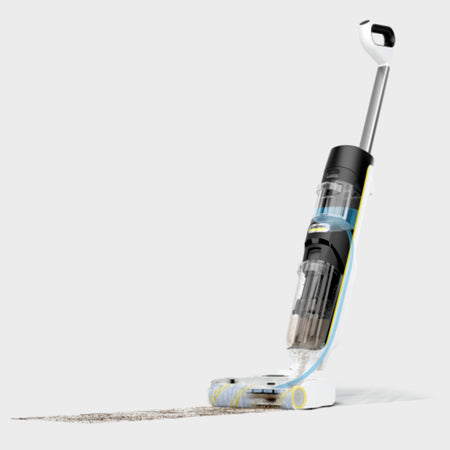 Découvrez le FCV 4 : l'outil polyvalent qui révolutionne le nettoyage des sols ! L'aspirateur laveur 3 en 1 doté de la fonction Xtra!Clean innovante aspire, nettoie et sèche sans effort les sols durs, les tapis et les liquides, et permet de gagner jusqu'à 50 % de temps*. Choisissez parmi 4 modes de nettoyage : le mode automatique avec capteur de saleté Dynamic!Control, le mode escalier de Stair!Assist intelligent, le mode sec ou le puissant mode Advanced!Power***. Défiez toutes les saletés, qu'il s'agisse de poussière, de poils d'animaux ou de taches tenaces. La technologie Hygienic!Spin ultime, avec jusqu'à 500 rotations de rouleaux par minute, garantit non seulement un résultat de balayage parfait, mais élimine également jusqu'à 99 % des bactéries** pour assurer une propreté hygiénique. Le puissant moteur BLDC et sa batterie endurante d'une autonomie de 45 minutes vous permettent de nettoyer jusqu'à 200 mètres carrés sans interruption. Par ailleurs, son écran Vision!Clean de 3,2 pouces, ses fonctions Auto-start-stop et d'autonettoyage ainsi que son rouleau Pure!Roll lavable offrent un confort maximal, sans jamais entrer en contact avec la saleté.