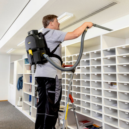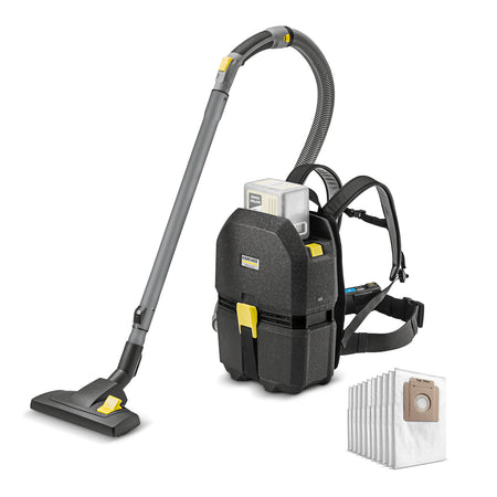 Kärcher fête ses 90 ans : ultra léger et performant, l'aspirateur dorsal sans fil BVL 3/1 Bp Anniversary Edition en noir est le premier aspirateur à afficher un poids dorsal de seulement 4,5 kilogrammes grâce au matériau EPP innovant tout en étant particulièrement robuste et durable. Idéal pour les concierges, les artisans et les particuliers : en effet, cet aspirateur dorsal sans fil doté d'une aspiration puissante convainc par son volume de cuve de 3 litres lors des tâches de nettoyage dans les espaces exigus et facilite le nettoyage ponctuel ainsi que le nettoyage des escaliers. La puissante batterie Kärcher Battery Power garantit à cet effet une autonomie élevée et le harnais ergonomique un travail sans fatigue. Grâce au tableau de commande pratique à la ceinture, le BVL 3/1 Bp Anniversary Edition se commande aisément et de manière très conviviale. Le moteur EC sans balais est en outre très peu sujet à l'usure. En plus des accessoires courants, d'autres équipements tels que le filtre HEPA 14 sont disponibles en option. Veuillez noter que pour cette version de l'appareil, la batterie Kärcher Battery Power ainsi que le chargeur correspondant doivent être commandés séparément. Fournis en exclusivité avec l'édition anniversaire : 10 sacs filtrants non tissés résistants à la déchirure.