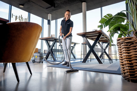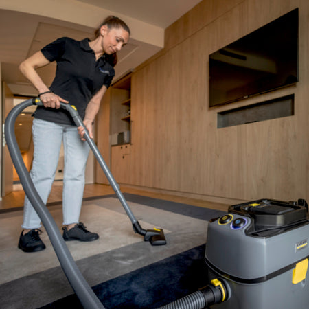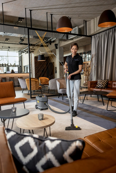 Notre aspirateur poussières sans fil compact T 15/1 Bp Adv avec un volume de cuve de 15 litres se caractérise par sa longévité, son vaste éventail d'accessoires et son rapport qualité-prix hors pair. Sa longévité et sa robustesse se reflètent également au niveau du châssis, du boîtier, du pare-chocs et des grandes roues. Cet aspirateur marque des points grâce à ses puissantes batteries Kärcher Battery Power+ (36 V) qui permettent d'excellents résultats de nettoyage. Avec 57 dB(A) à peine, il est en outre assez silencieux pour pouvoir être utilisé à tout moment, y compris dans les lieux sensibles au bruit. Étant donné qu'il est constitué de 45 % de matières recyclées*, les ressources sont protégées dès le départ. Le T 15/1 Bp Adv dispose d'une poignée de transport au format rabattable, permettant un transport ergonomique, en plus d'être maniable et stable. La fourniture inclut un suceur pour fentes et un suceur fauteuil qui peuvent toujours être rangés à portée de main sur l'aspirateur. De nombreux accessoires sont également inclus : flexible d'aspiration, coude antistatique, tube d'aspiration télescopique léger et réglable en hauteur (aluminium), suceur pour sol commutable et suceur parquet. Veuillez noter que la batterie ainsi que le chargeur rapide correspondant doivent être commandés séparément.