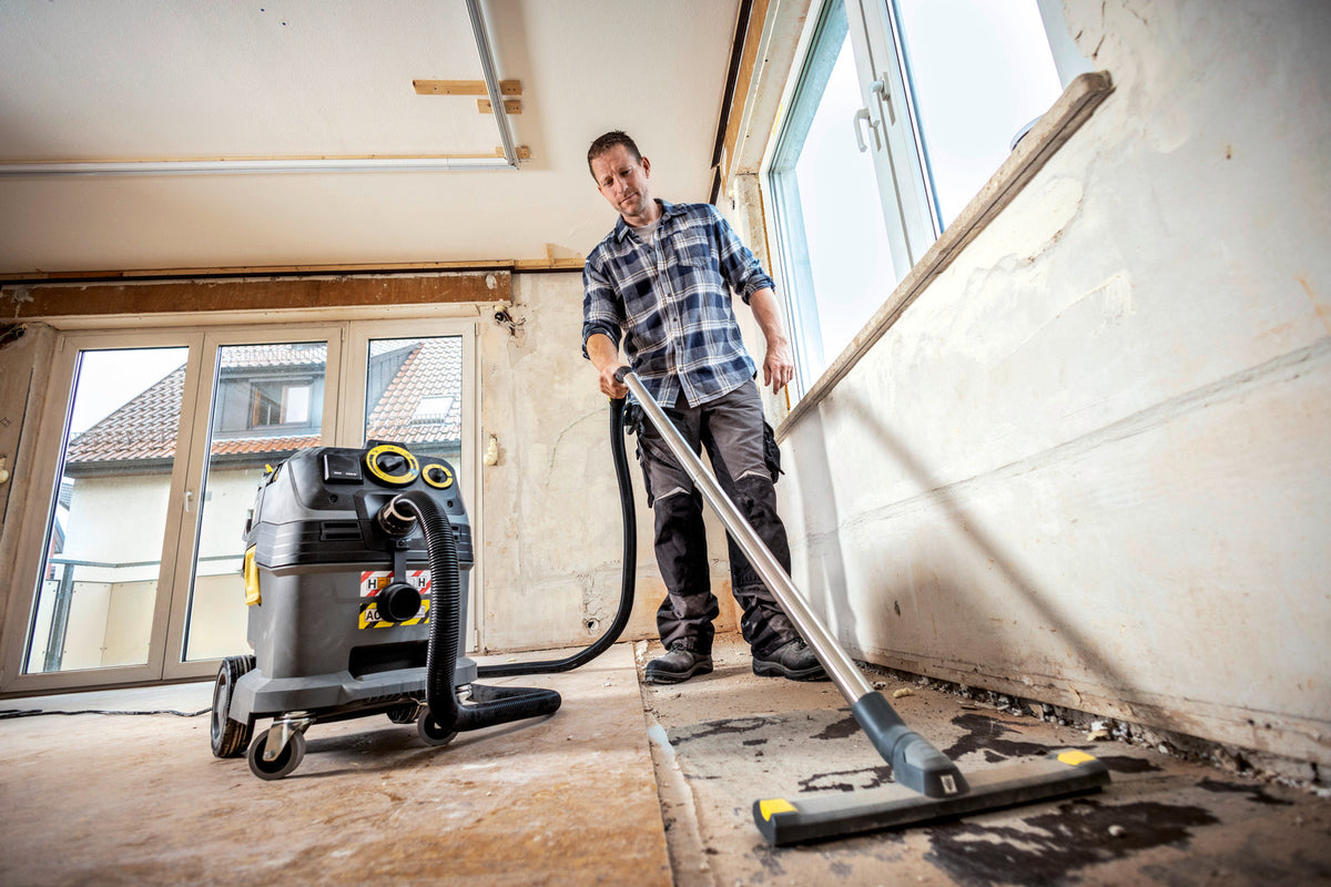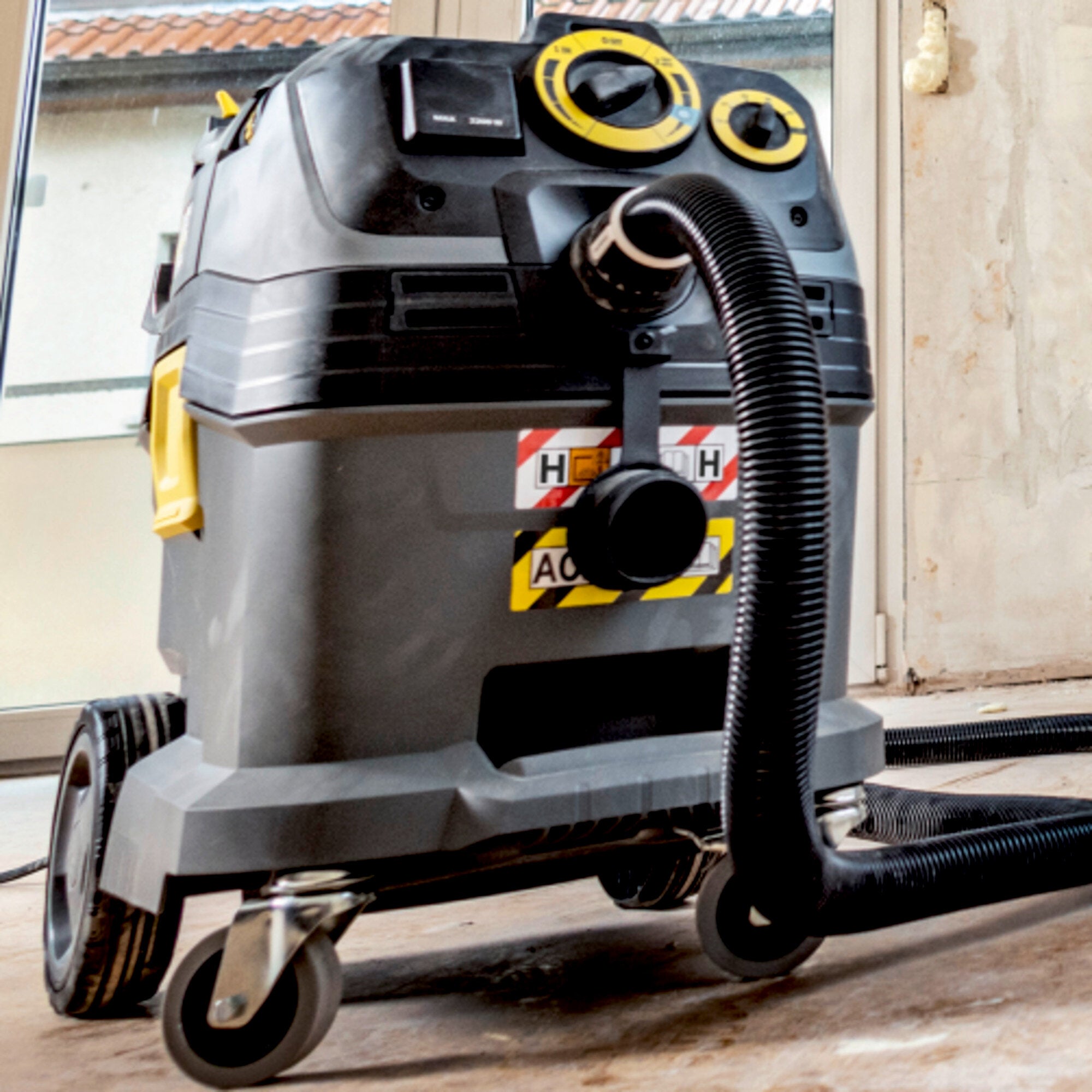 Les travaux de rénovation dans les bâtiments anciens libèrent souvent de l'amiante et d'autres substances nocives et cancérigènes, qui doivent être éliminées immédiatement. Le NT 30/1 Tact Te H ACD est l'aspirateur eau et poussières approprié à cette application. Il a été testé et approuvé selon la nouvelle norme ACD (Appliance for the Pickup of Combustible Dust), conformément à la norme CEI 60335-2-69:2021, pour l'aspiration de poussières inflammables ainsi que pour toutes les poussières de la classe H. Grâce à son design compact et mobile, il se transporte aisément d'un lieu d'utilisation à un autre. Le filtre plissé plat nettoyable Safety/HEPA permet de collecter en toute sécurité les poussières dangereuses avec des sacs filtrants de sécurité ou des sacs d'évacuation en PE ; de grandes quantités de poussières moins dangereuses peuvent être aspirées directement dans le réservoir. Le décolmatage du filtre commandé par un capteur Tact assure une puissance d'aspiration élevée en permanence grâce à un filtre toujours propre. Une prise d'appareil avec démarrage automatique ainsi qu'un système antistatique avec des accessoires conducteurs complètent le concept bien pensé du NT 30/1 Tact Te H ACD.