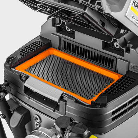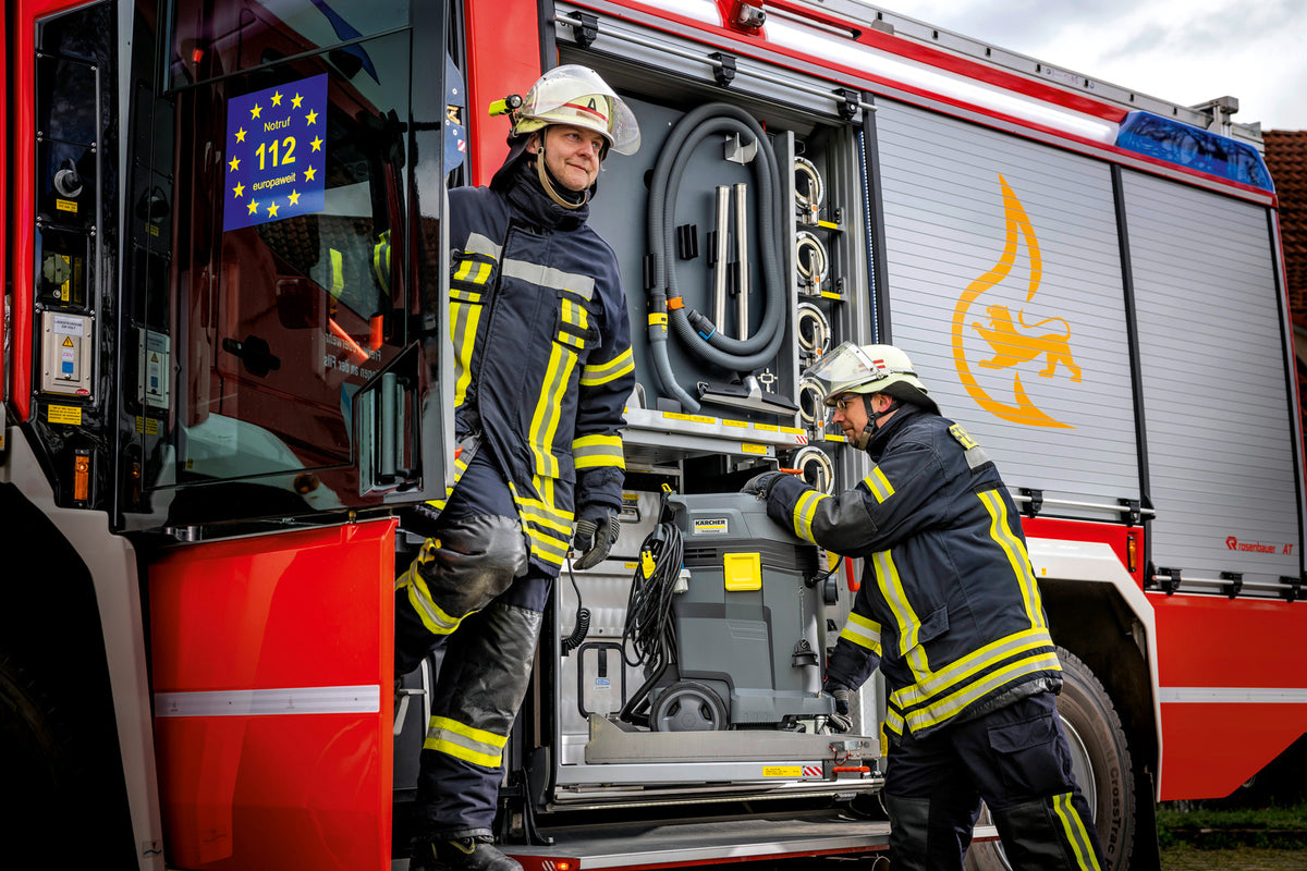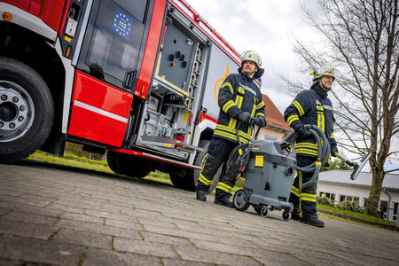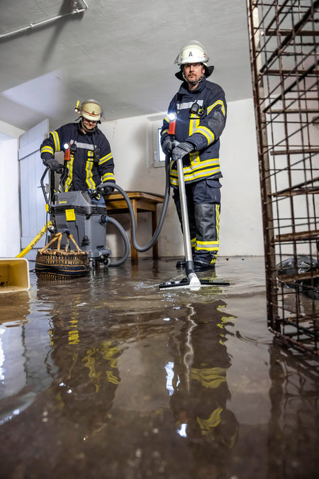 Extrêmement puissant, très robuste et facile à transporter : l'aspirateur eau et poussières NT 50/1 Mwf de Kärcher répond aux exigences les plus poussées lors des interventions des sapeurs-pompiers. Équipé d'une cuve de 50 litres, de roulettes pivotantes métalliques et d'un guidon réglable en continu, cet appareil mobile arrive rapidement sur le lieu d'intervention où il est immédiatement prêt à l'emploi grâce à un raccord Storz pour la connexion de tous les tuyaux d'incendie courants. La pompe d'évacuation pour eau chargée refoule jusqu'à 330 litres d'eau par minute – un débit optimal pour une élimination rapide des grandes quantités d'eau comme celles rencontrées pendant les opérations d'extinction ou les interventions en cas de crues. La sécurité des personnes et de la machine est garantie par un disjoncteur différentiel de protection individuelle PRCD-K à fiche IP68 conçu spécialement pour être utilisé avec les groupes électrogènes ainsi que par un panier à filtre gros déchets qui protège efficacement la pompe d'évacuation pour eau chargée contre les obstructions causées par des pierres, des feuilles mortes ou du bois aspirés. Par ailleurs, l'aspirateur pour sapeurs-pompiers NT 50/1 Mwf est équipé d'un flexible d'aspiration résistant à l'huile ainsi que d'un suceur pour sol haut de gamme en aluminium.