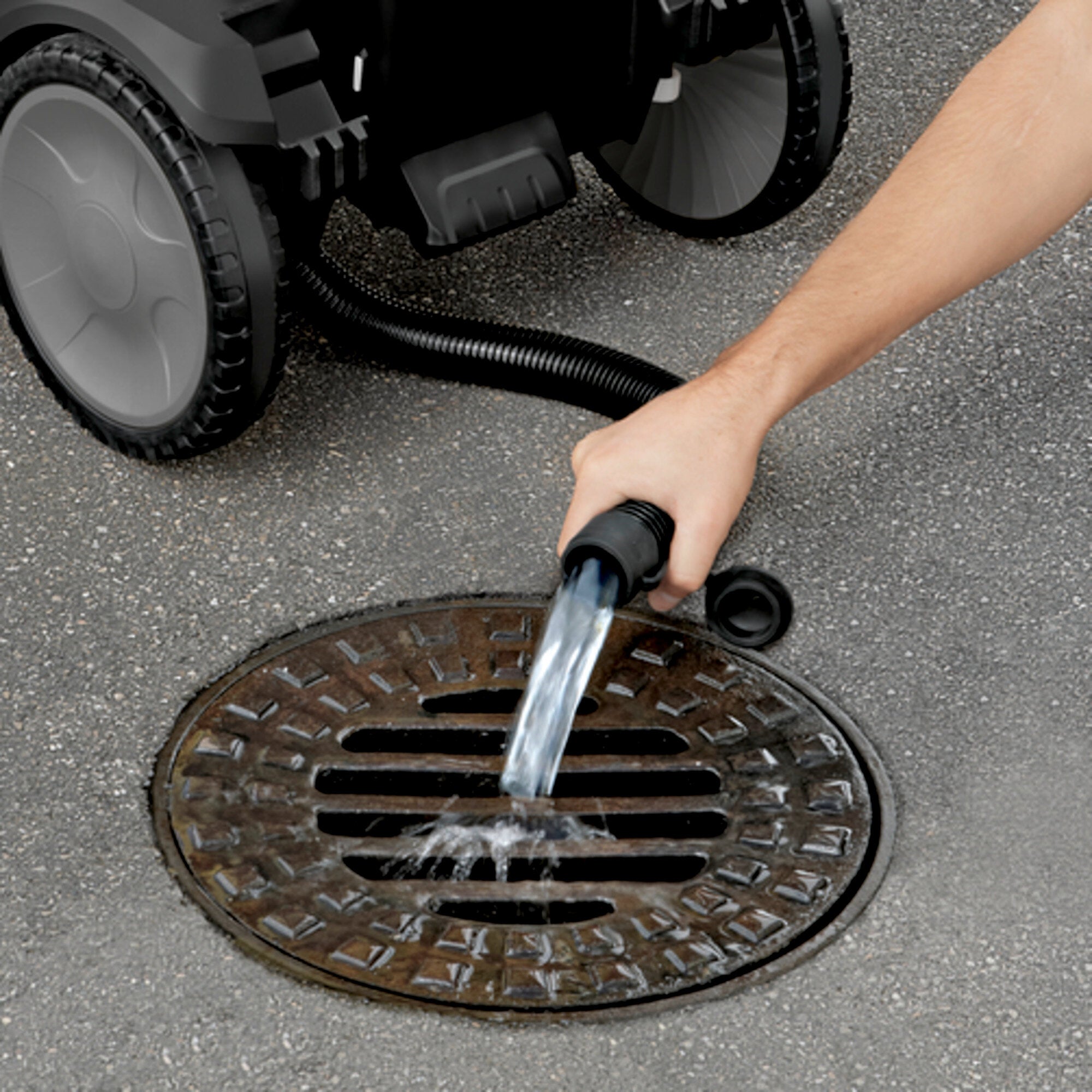 - Flexible d'évacuation pour la vidange directe des liquides aspirésLe couvercle reste fermé jusqu'au point de vidange.
