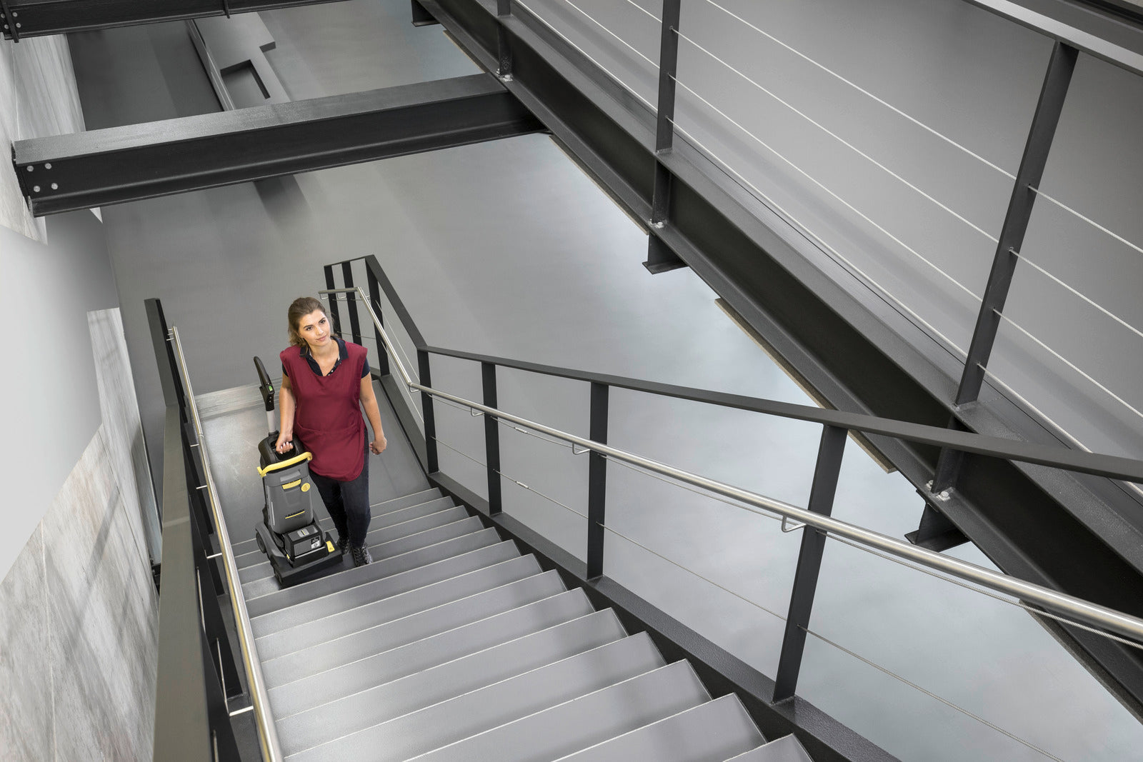 Un nettoyage comme à la main, mais en mieux : grâce à sa forme compacte, son tout petit poids de 14 kg et sa batterie lithium-ion longue durée offrant environ 30 minutes d'autonomie, notre autolaveuse aspirante BR 30/4 C Bp fonctionnant sur batterie est une véritable alternative au nettoyage manuel des surfaces dures jusqu'à 200 m². Sa pression de contact, 10 fois supérieure à celle d'un simple balai pourvu d'une serpillière, et sa vitesse du rouleau d'environ 1500 tours garantissent également de bien meilleurs résultats de nettoyage. L'aspiration peut se faire aussi bien en marche avant qu'en marche arrière. En cas de salissures particulièrement tenaces, les suceurs d'aspiration peuvent également être relevés afin de prolonger le temps d'action de la flotte de nettoyage. Tout de suite après le nettoyage, les sols restent propres, mais surtout secs et antidérapants. Cet appareil sans fil et très mobile est parfait pour nettoyer les sols des petits magasins, restaurants, stations-service, supermarchés, sanitaires, cuisines ou même en complément des autolaveuses aspirantes plus grandes déjà à disposition.