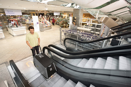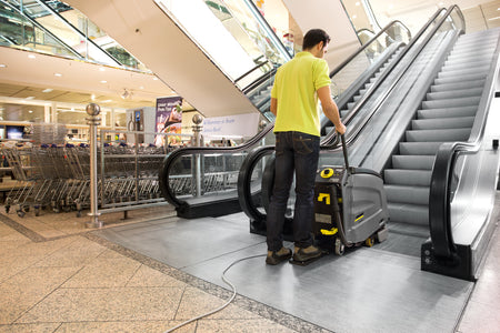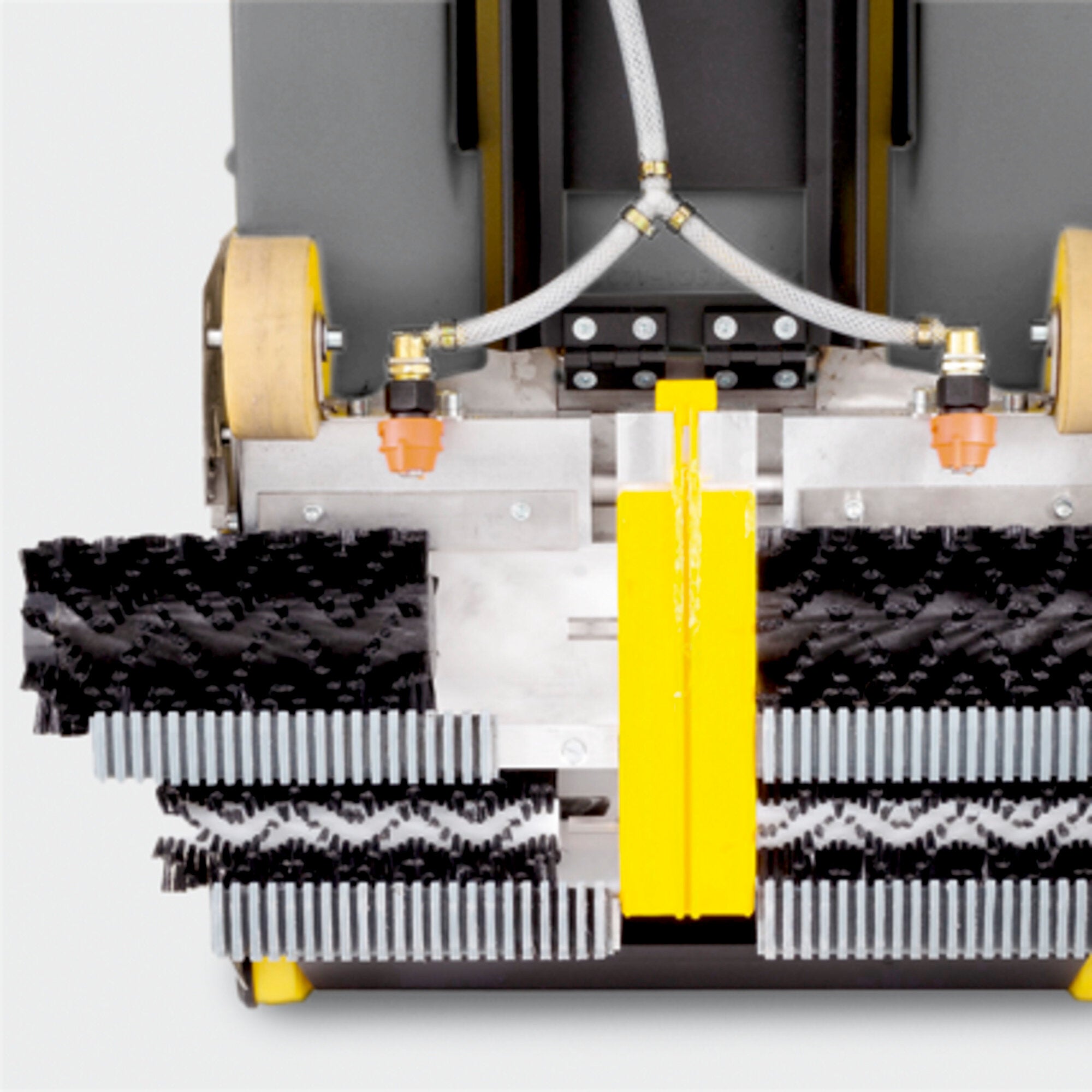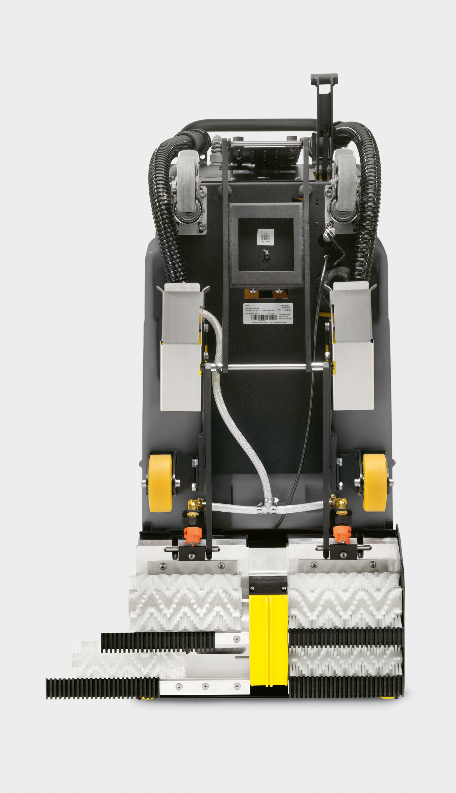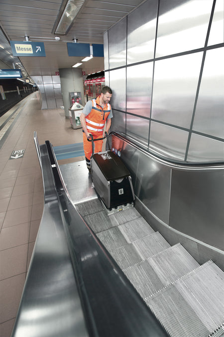 Grâce à la BR 47/35 ESC, le nettoyage s'effectue très facilement lorsque l'escalator ou le tapis roulant est en marche. La machine est placée au bas de l'escalator. Les buses pulvérisent une solution de nettoyage sur les brosses de nettoyage qui nettoient les rainures des tapis roulants ou des escalators. L'eau sale est aspirée au cours de la même opération. Des brosses réceptrices spéciales absorbent l'eau et la transportent vers les fentes d'aspiration. La forme de la tête de brossage et le moteur des brosses monté au centre permettent de travailler des deux côtés au plus près des bords avec deux brosses-rouleaux. Ainsi, l'escalator est parfaitement nettoyé jusque dans les rainures les plus profondes. Un patin de centrage dans la zone centrale de la tête de brossage assure un guidage sûr de la machine. La BR 47/ 35 ESC est adaptée aux escalators et tapis roulants de nombreux fabricants différents. Le réglage sur les différents escalators s'effectue en remplaçant les quatre différents kits de peignes qui s'introduisent dans les rainures de l'escalator et assurent une étanchéité lors de l'aspiration.