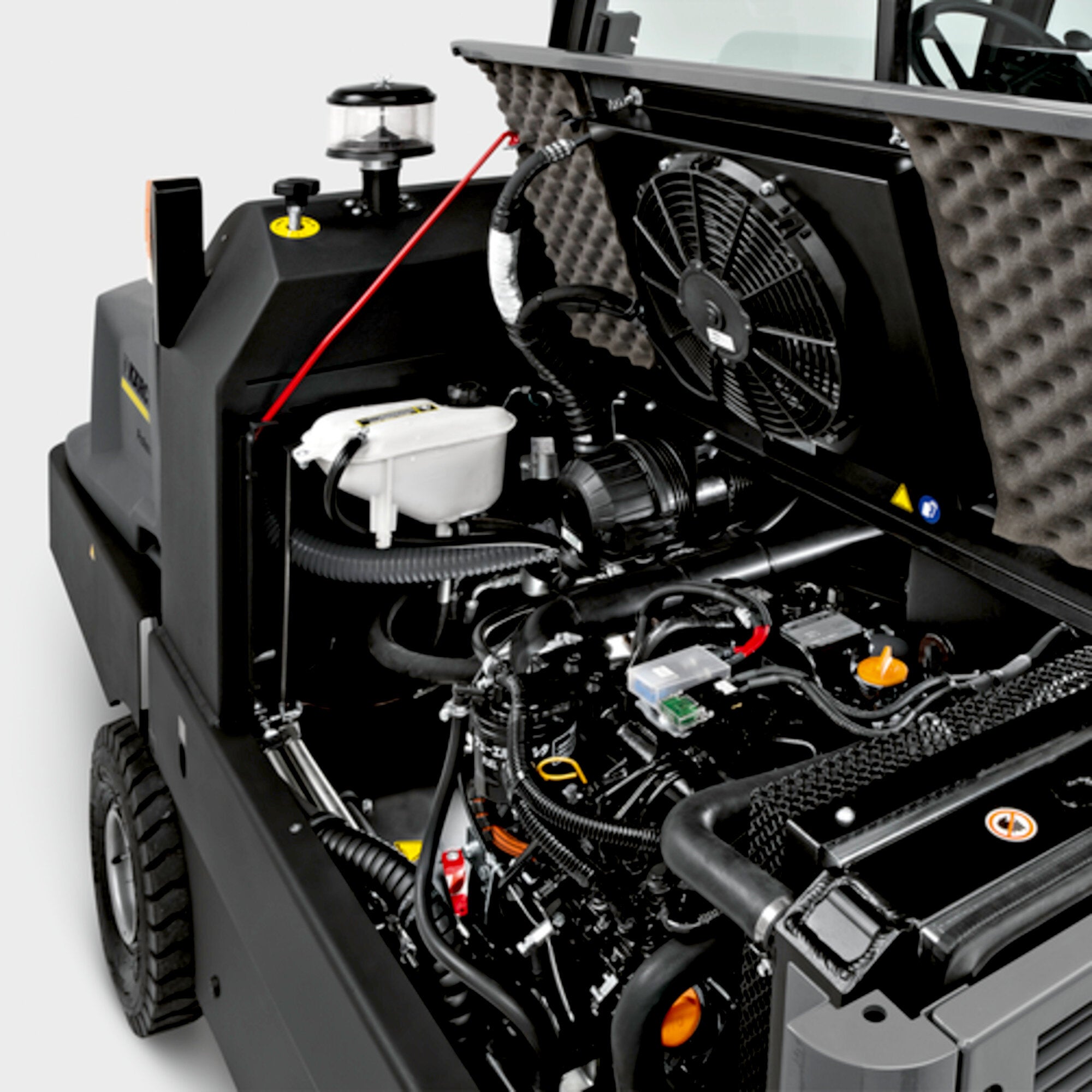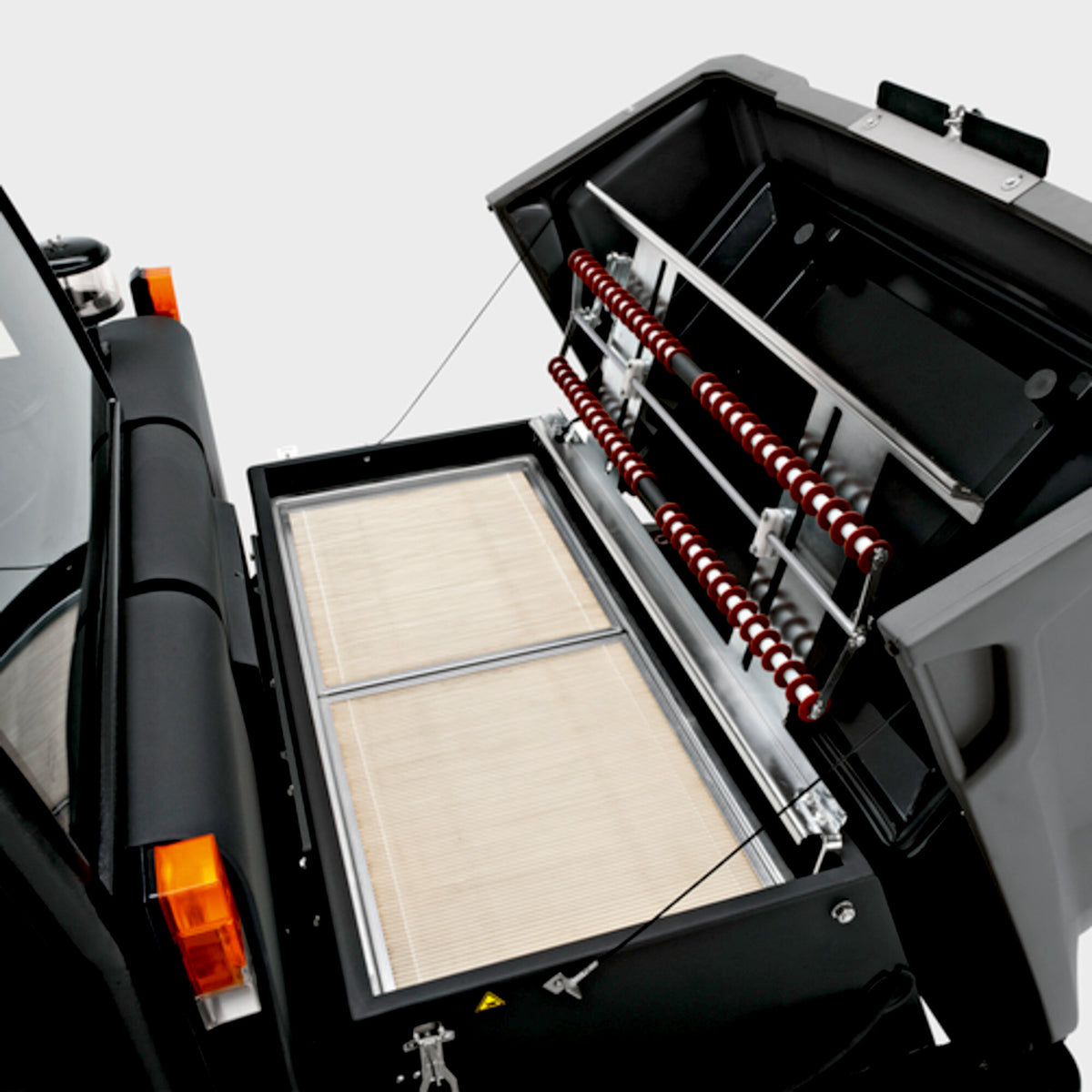 - Grande facilité d'utilisation, de maintenance et d'entretienUne technologie simple avec des composants testés : entraînement entièrement hydraulique, électrique au lieu d'électronique.Accès au moteur rapide pour une maintenance simplifiéeBalai principal et filtre plissé plat peuvent être remplacés sans outils.