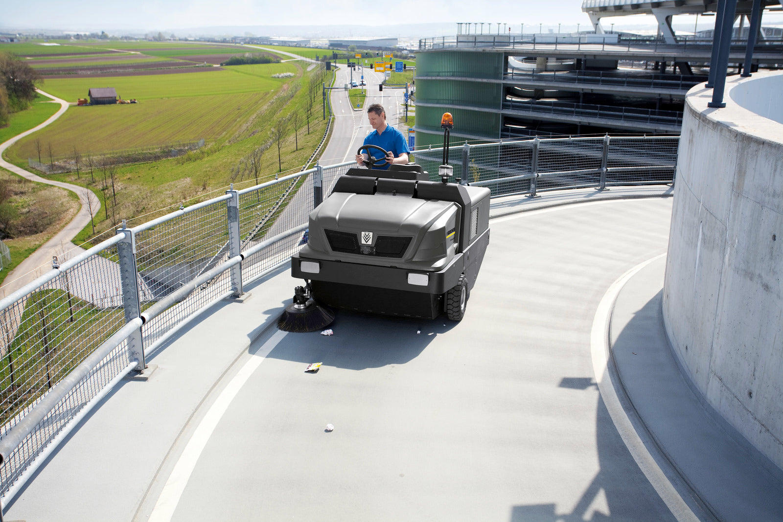 La KM 150/500 R D est une balayeuse aspirante autoportée à moteur Diesel pour le nettoyage de grandes surfaces extérieures. Elle offre un rendement surfacique allant jusqu’à 21000 m²/h. La maintenance de la machine est limitée. Le vidage du bac à déchets est facilité par le système de relevage hydraulique. Le balai principal est réglable. Le décolmatage du filtre est automatique pour une aspiration optimale. La KM 150/500 R D permet de débarrasser des surfaces industrielles de tous types de déchets (poussières, etc.)et les changer sans outils. Le moteur est tout aussi facile d'accès. Grâce au concept EASY Operation, les fonctions de base peuvent être commandées en toute simplicité à l'aide d'un bouton rotatif. Un filtre cyclonique purifie l'air avant même qu'il ne pénètre dans le filtre du moteur, augmentant ainsi considérablement sa durée de vie.