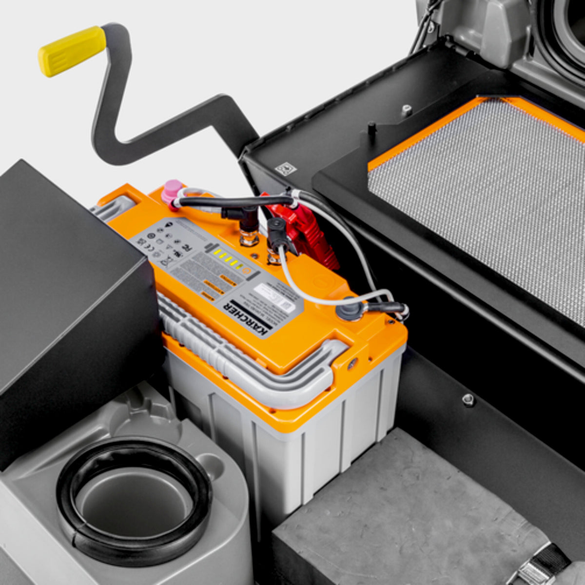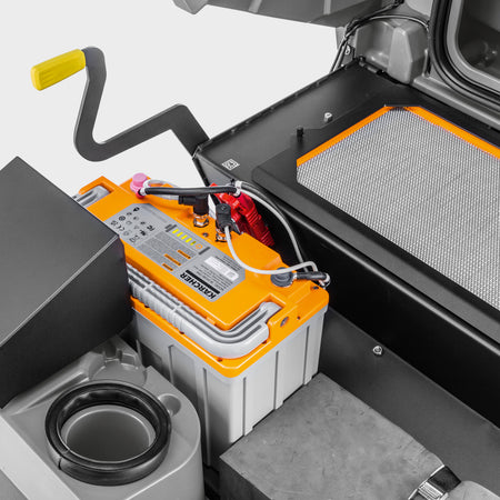 Équipement exceptionnel, utilisation très facile et confortable, format particulièrement compact – notre balayeuse aspirante autoportée KM 85/50 R sait se montrer convaincante à tous les niveaux. Ainsi, sa fourniture inclut par exemple une puissante batterie lithium-ion durable d'une capacité de 80 Ah et le chargeur rapide correspondant. Également de série : la brosse latérale à écartement automatique avec réglage de la vitesse de rotation, un grand filtre antipoussière pour un travail sans dégagement de poussière et l'indicateur d'usure visible de l'extérieur pour le balai principal. Grâce à sa conception élaborée et compacte, la KM 85/50 R séduit par son agilité et sa maniabilité qui permettent également de l'utiliser pour les nettoyages dans les espaces exigus et encombrés. En outre, l'appareil offre un concept d'utilisation simple avec des détails pratiques tels que le rouleau à suspension oscillante pour d'excellents résultats, y compris sur les sols irréguliers, ou le décolmatage du filtre antipoussière depuis le siège. La large ouverture du capot de l'appareil facilite grandement les travaux de maintenance et le remplacement du balai principal est également possible sans outils. En outre, le système Home Base intégré permet d'emporter facilement des ustensiles de nettoyage supplémentaires.