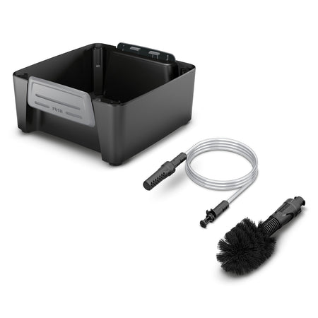 Idéal si vous êtes souvent en route: le Adventure Box (la boîte avec accessoires pour les avonturiers) avec des accessoires parfaitement ajustés au nettoyage de votre équipement pour l'extérieur, n'importe où vous vous trouvez. La brosse universelle qui peut être montée sur le pistolet, dissout les salissures tenaces à l'aide de ses poils doux et les rince. Grâce au tuyau d'aspiration vous pouvez également utiliser l'eau des sources alternatives, comme les puits ou les citernes. Et, dernier point mais non le moindre, les accessoires peuvent être rangés dans une boîte pratique qui peut être fixées sur le nettoyeur à pression.