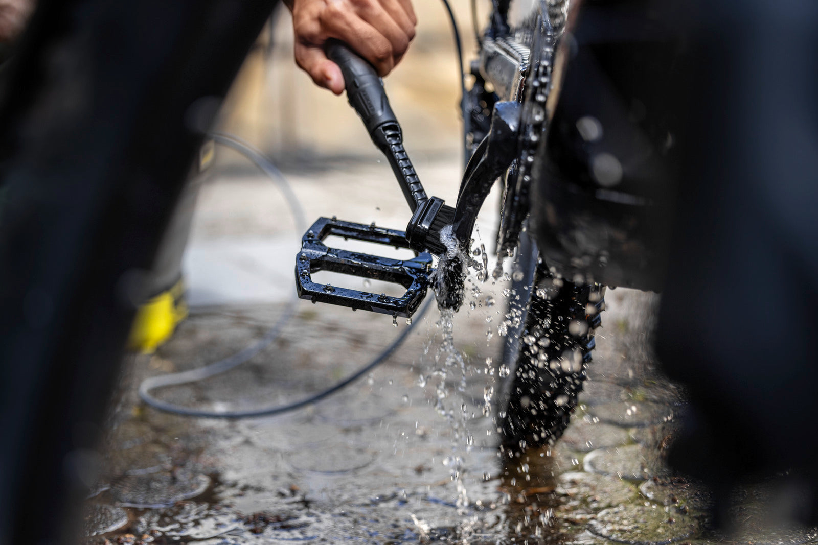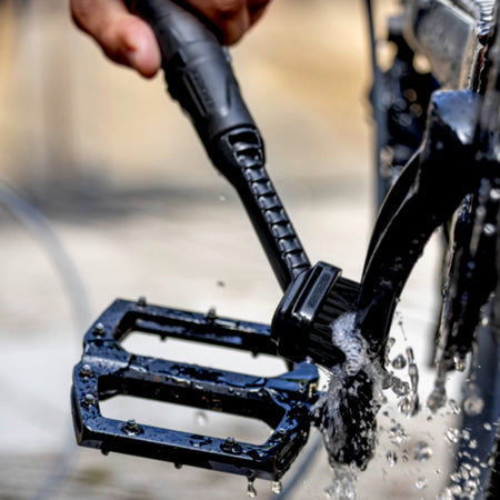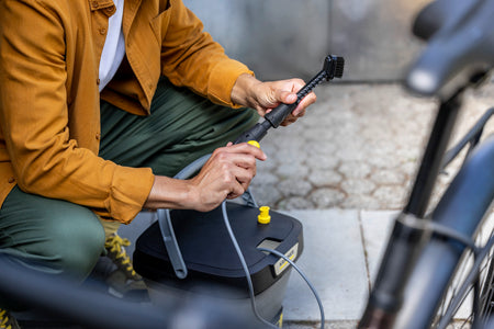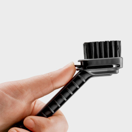La brosse de précision associe l'effet d'un jet d'eau plat en éventail et du pouvoir nettoyant mécanique des poils pour un nettoyage en profondeur des endroits difficiles d'accès et étriqués, par exemple sur un vélo. La saleté est décollée et rincée directement dans la foulée. Étant donné que l'eau n'est dispensée que lorsque la gâchette de l'appareil est actionnée, la consommation d'eau peut être régulée très efficacement et individuellement. De cette façon, la batterie est ménagée par la même occasion. Le montage de la brosse se fait directement sur le pistolet. La tête de brossage peut être remplacée au besoin. La brosse de précision est compatible avec tous les nettoyeurs mobiles extérieurs OC 3.