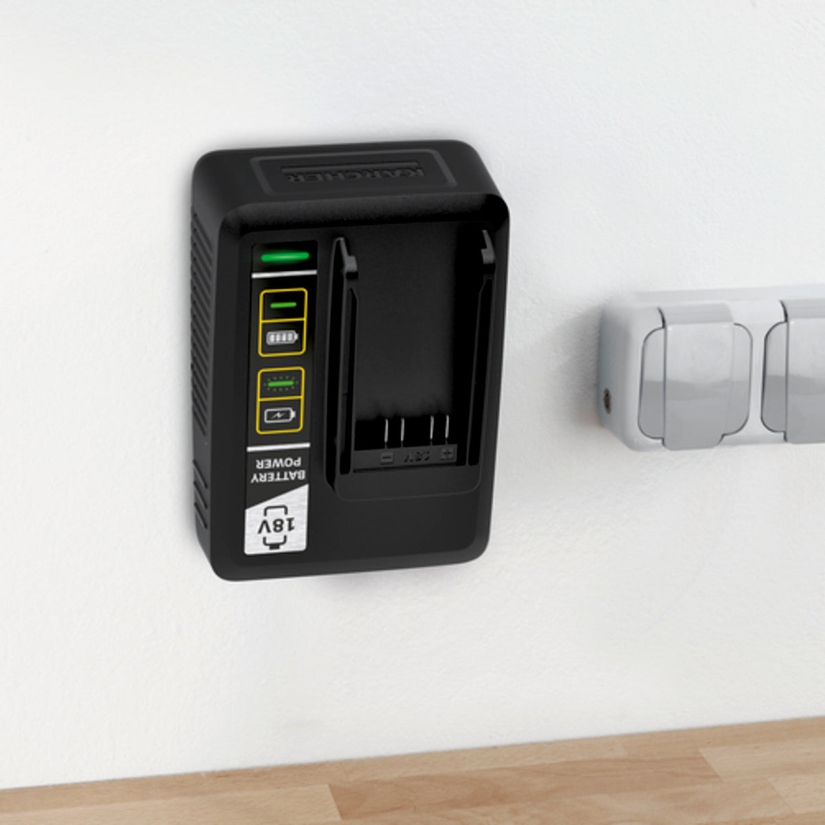 Grâce au support mural intégré, le chargeur rapide se fixe très simplement au mur. Avec ce chargeur rapide, la batterie interchangeable Kärcher Battery Power 18 V/2,5 Ah se recharge à 80 % en seulement quarante-quatre minutes. Il permet aussi de recharger toutes les autres batteries interchangeables 18 V de la plateforme de batterie Kärcher 18 V.
