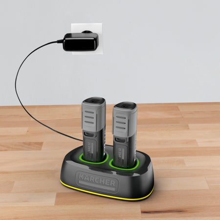 - Contenu de la livraison : le chargeur rapide Duo Battery Power 4 V de Kärcher. Les batteries lithium-ion compatibles Kärcher Battery Power 4/25 sont disponibles séparément