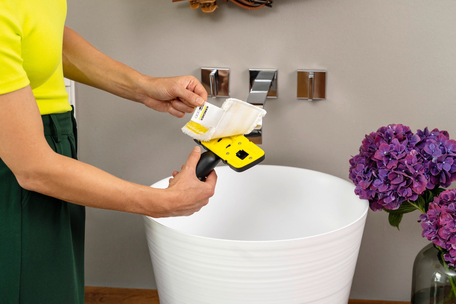Les deux chiffons en microfibre haute qualité fournis permettent d'éliminer et de capturer les salissures tenaces dans la salle de bains et la cuisine. Même les saletés les plus résistantes sur la cuisinière sont supprimées sans effort. Le système pratique et fiable de fixation par velcros permet de fixer le chiffon sur le suceur à main ainsi que de le remplacer rapidement sans contact avec la saleté.