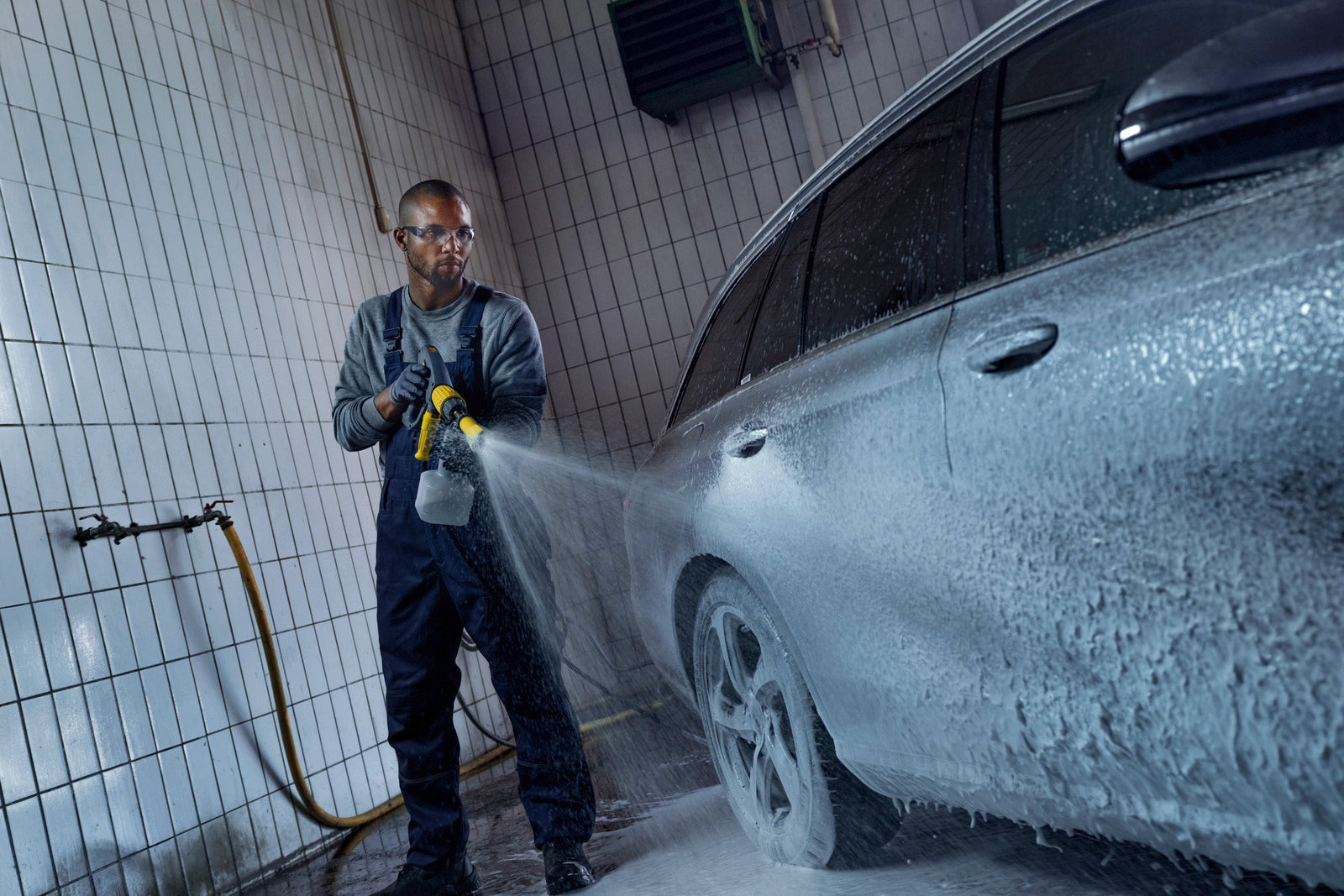 Pour une application facile, directe et sans contact à l'aide de lances à mousse sans mélange préalable : le détergent moussant RM 838 direct PressurePro de Kärcher. Ce détergent exempt de silicone forme une mousse alcaline microporeuse, volumineuse et persistante, y compris sur les surfaces verticales. Les huiles, les graisses, les résidus d'insectes, les fientes d'oiseaux, la saleté de la route et même les salissures très adhérentes issues de l'agriculture sont ainsi éliminées de manière fiable de tout type de véhicule. Qu'il s'agisse de voitures, de poids lourds, d'engins et de machines dans les exploitations agricoles ou encore d'engins de voirie : grâce à la mousse adhérente, aucun outil mécanique tel qu'une brosse n'est requis, ce qui évite les micro-rayures sur les surfaces peintes. Le temps d'action rapide du détergent moussant RM 838 direct PressurePro accélère en outre considérablement l'ensemble du nettoyage manuel de véhicules.