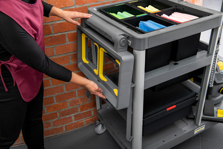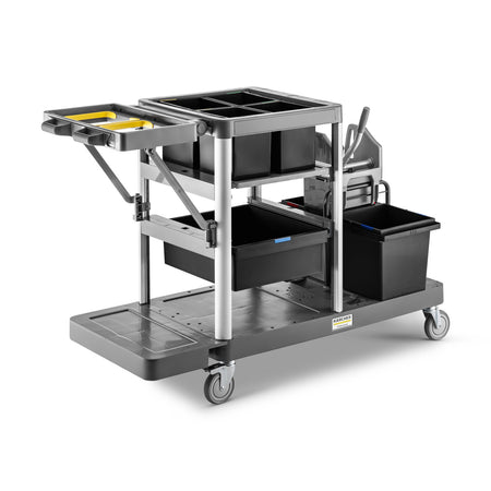 Le FM Expert 100/ W est un grand chariot de nettoyage ouvert pour une utilisation efficace dans le cadre des tâches de nettoyage d'envergure. Il dispose d'un système à double seau variable avec une presse d'essorage universelle. En retirant les seaux et la presse d'essorage, il est possible d'intégrer une machine à la place. Le module d'élimination se règle en hauteur de manière variable et convient pour des sacs poubelle de différentes tailles. Les ustensiles de nettoyage se rangent dans 4 seaux de 6 litres qui peuvent être séparés selon les différentes utilisations. En outre, un tiroir de 16 litres à fixation individuelle et amovible offre un espace de stockage généreux pour emporter d'autres équipements. Les raccords Toolflex inclus permettent une intégration compacte de balais à plat, de pinces et d'autres équipements. Un crochet est prévu pour fixer un panneau d'avertissement ou le WVP 10 Adv. Les raccords Toolflex et le crochet se mettent en place de manière variable sur les faces extérieures du FlexoMate.