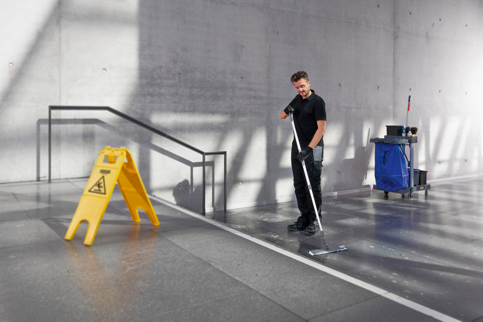 Le chariot de nettoyage fonctionnel et ouvert FM Swift 50/ W est une merveille en matière d'encombrement et optimal pour les locaux de stockage particulièrement réduits qui offrent peu de place. Équipé d'un système à double seau et d'une presse d'essorage universelle, il est l'allié parfait pour les tâches de nettoyage exigeantes et manuelles, y compris dans les passages étroits. Le module d'élimination peut être réglé en hauteur de manière variable ou rabattu pour gagner de la place. Il est compatible avec des sacs poubelle de différentes tailles. Les deux seaux de 6 litres permettent de ranger les ustensiles de nettoyage en toute sécurité et de les séparer selon leur utilisation (bleu pour les zones non critiques et rouge pour les zones à nettoyer aux exigences maximales en matière d'hygiène telles que les sanitaires et les toilettes). Au lieu d'un seau de 6 litres, il est également possible au choix d'y placer 2 à 4 détergents.