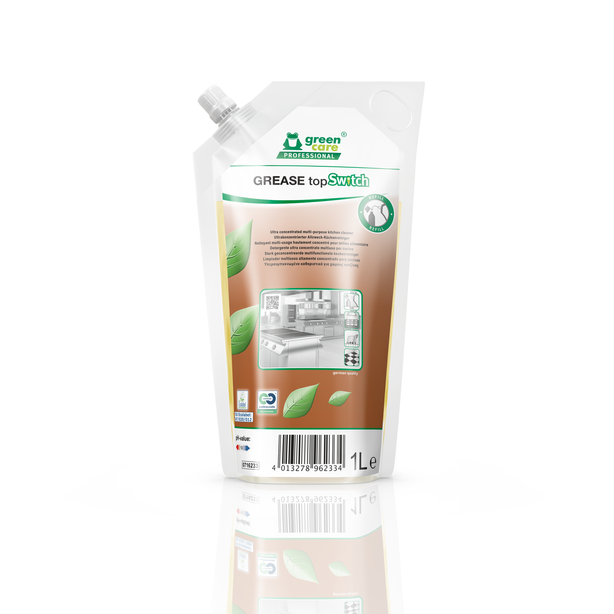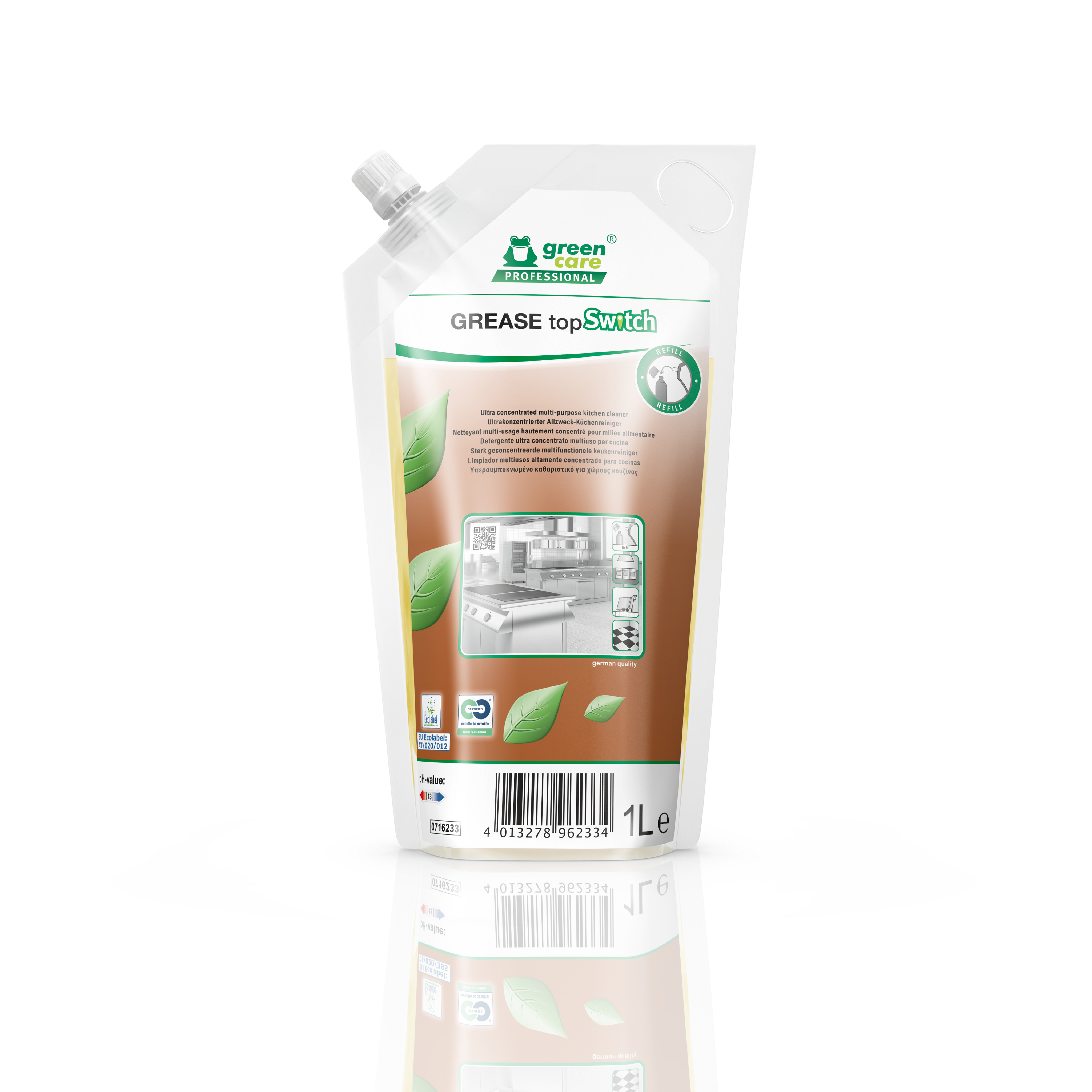 - L’emballage de GREASE topSwitch se compose d’un flacon et d’un bouchon de dosage Switch véritablement durables, fabriqués à 100 % à partir de matériaux recyclés post-consommation, grâce auxquels un dosage précis et sûr est garanti sans contact direct avec le produit concentré.