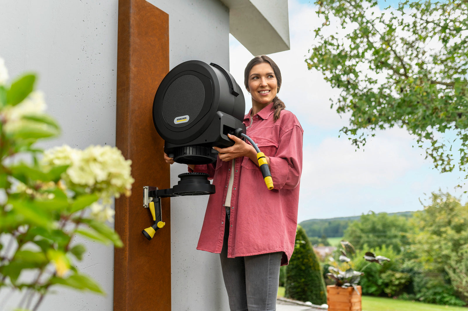 - FlexChangeSans vis, sans outil, sans stress : grâce au système unique, FlexChange de Kärcher, le dévidoir peut être retiré en quelques secondes du support mural ou du pic de fixation (par ex. pour l’hiver).Prêt à l'emploiAccessoires d’arrosage compris dans la livraison.