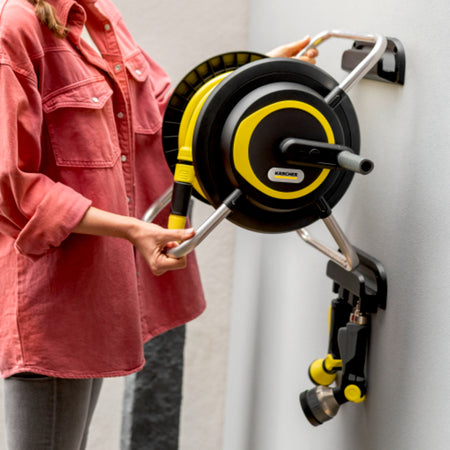 Simplement pratique. Double fonction. Cette station d’arrosage sert à la fois de support de rangement mural pour le tuyau d’arrosage mais aussi de chariot dévidoir pour circuler aisément dans le jardin. Le support mural permet d’avoir toujours les pistolets et les lances d’arrosage à portée de main. La HR 4.30 se retire sans peine de son support et est facile à transporter grâce à la poignée ergonomique. La manivelle qui tourne librement permet d’enrouler le tuyau d’arrosage sans effort et de le ranger soigneusement et de manière ordonnée, sans le plier et sans manipulations fastidieuses. Le produit se distingue en outre par son format compact et une grande stabilité grâce au centre de gravité très bas, ainsi qu’un tuyau d’arrosage de 30 mètres, des raccords, un adaptateur pour robinet et un pistolet d’arrosage. L’enrouleur de flexible est livré déjà monté et prêt à l’emploi. De plus, l’appareil est protégé contre les UV et le gel, ce qui lui assure une durée de vie prolongée et une robustesse à toute épreuve pour l’usage quotidien. Kärcher propose une garantie de 5 ans.