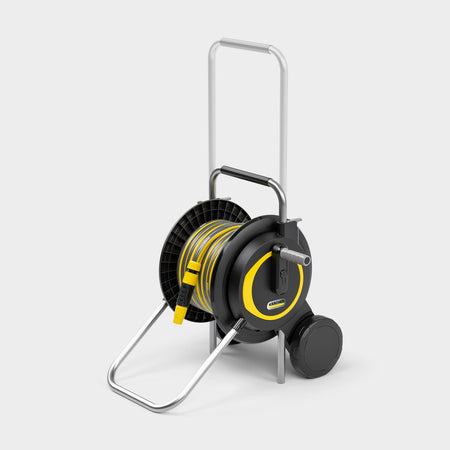 Le chariot dévidoir robuste et stable permet de ranger le tuyau d’arrosage sans encombrer et offre une prise en main très confortable. Grâce à la manivelle ergonomique, le tuyau peut être enroulé de manière ordonnée. Le chariot dévidoir se distingue en outre par un pied d’appui extra large pour une stabilité optimale, une excellente résistance aux UV et au gel, ainsi qu’un porte-pistolet pratique monté sur la poignée. Le kit intégral comprend un tuyau d’arrosage de 20 mètres ainsi qu’un pistolet d’arrosage et des accessoires d’arrosage Kärcher. Grâce au système innovant d’attache rapide, la poignée télescopique peut être aisément ajustée à la hauteur appropriée ou complètement escamotée vers le bas. Kärcher propose une garantie constructeur de 5 ans. Le chariot dévidoir est livré entièrement monté.