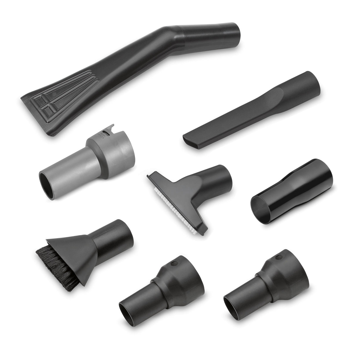 Kit d'accessoires en diamètre nominal DN 35 développé pour le nettoyage en profondeur des sièges, des tapis de sol, des interstices et du tableau de bord des véhicules à l'aide d'aspirateurs eau et poussières. Comprend un suceur d'aspiration auto, un suceur fauteuil, un suceur pour fentes et un suceur pinceau. Inclut également des adaptateurs spéciaux avec système d'attache dans les diamètres nominaux DN 35 et DN 40, permettant l'utilisation des anciens comme des nouveaux modèles d'aspirateur eau et poussières de Kärcher. En outre, ces adaptateurs offrent la possibilité de fixer les buses directement au flexible d'aspiration, sans avoir à utiliser le coude, pour une aspiration encore plus flexible dans les habitacles exigus.
