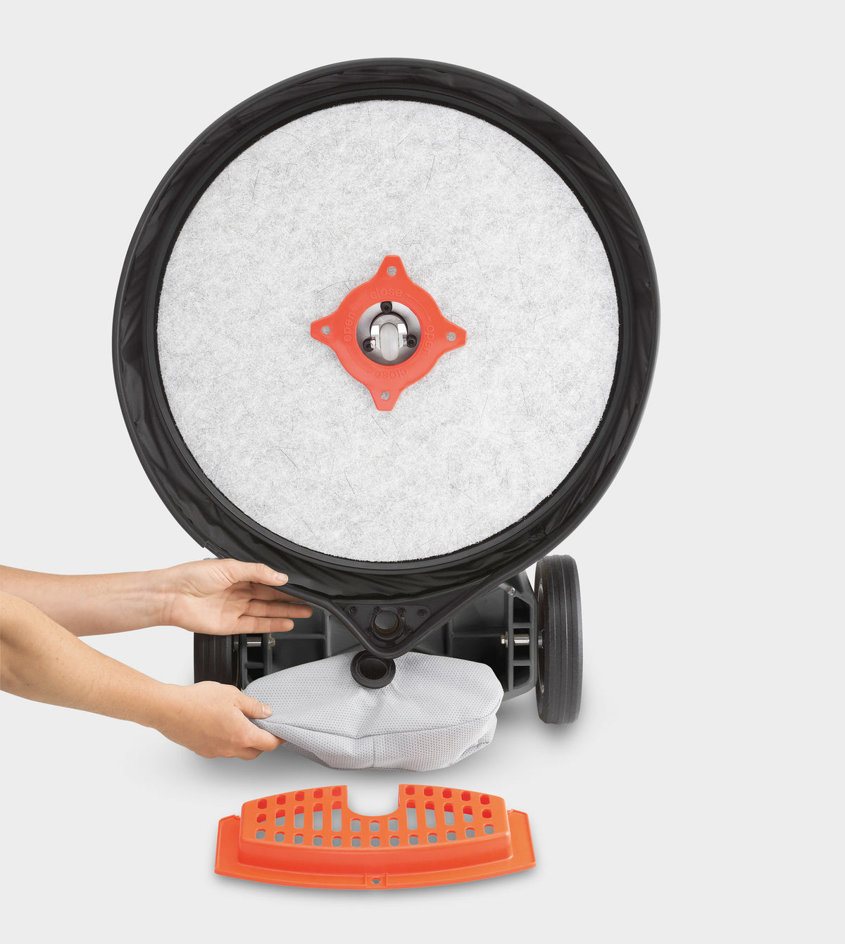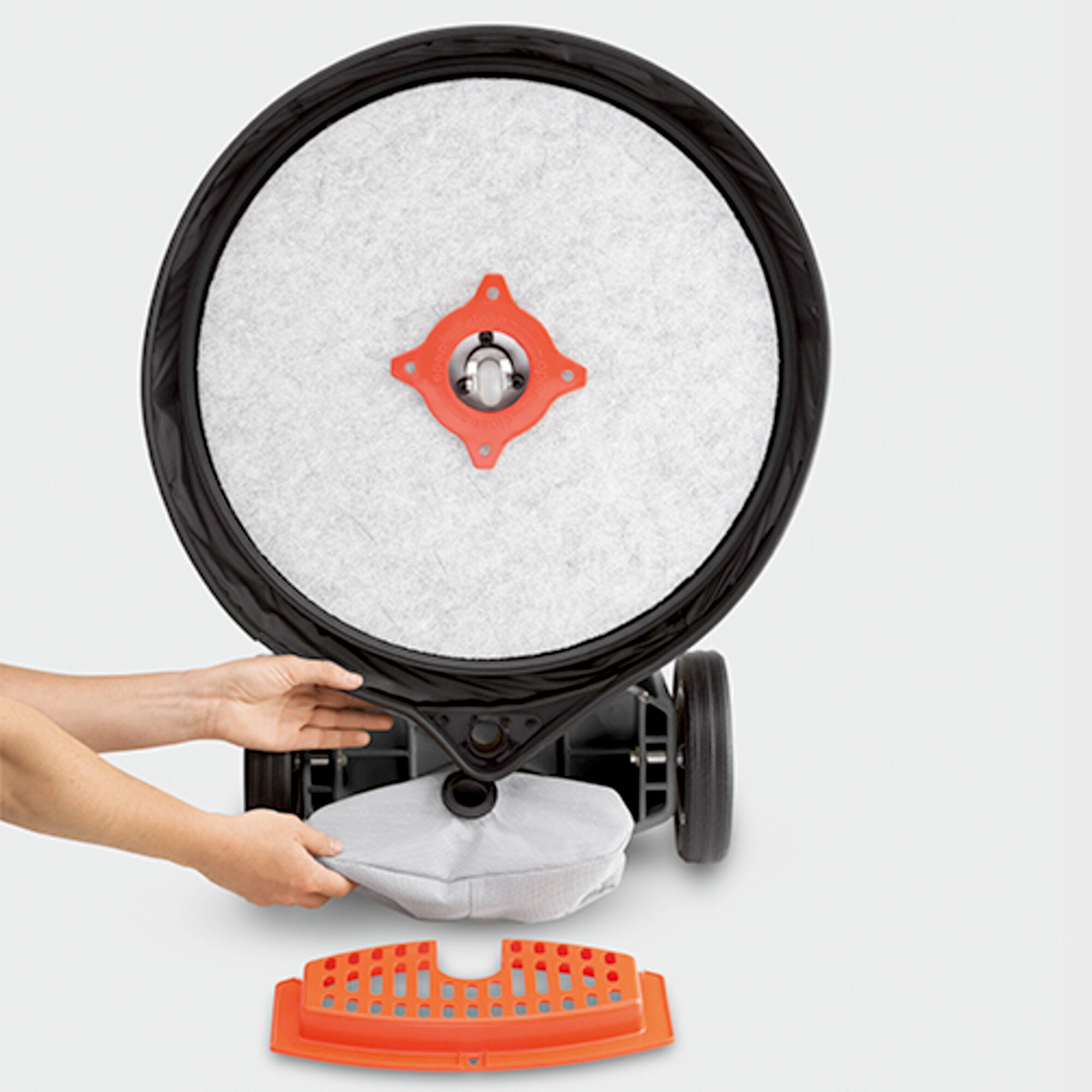 - Système d'aspiration intégré.Récupération des résidus et poussières par flux d’air et jupe périphérique flottante pour un travail sans trace.Les poussières collectées sont faciles à vider. Le sac filtrant est réutilisable.