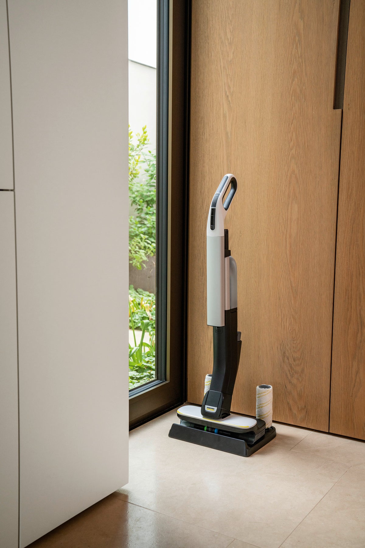 Le nettoyeur de sols FC 4-4 de Kärcher lave et essuie en une seule étape. Le nettoyeur de sols sans fil est équipé de deux rouleaux rotatifs en microfibres qui ramassent toute la saleté et la poussière. Le filtre à cheveux intégré permet d’enlever facilement les cheveux du sol. Les rouleaux de nettoyage sont humidifiés en permanence grâce au réservoir d'eau propre. Le FC 4-4 assure ainsi la propreté des sols durs, comme le parquet, stratifié, vinyle ou carrelage. Deux modes de nettoyage sont disponibles pour travailler avec la quantité d'eau et la vitesse de rotation idéales en fonction du sol. Le design de la tête de nettoyage garantit une élimination en profondeur de la saleté sur les bords et dans les recoins. De plus, le nettoyeur de sols est très facile à guider et à manœuvrer, même sous les meubles bas, grâce à son articulation flexible. Le FC 4-4 dispose de deux réservoirs : le réservoir d'eau propre de 400 ml, facile à retirer et à remplir. Pendant le nettoyage, l'eau et la saleté résiduelles se retrouvent dans le réservoir d'eau sale de 200 ml. Lorsque le réservoir d'eau claire est vide ou que le réservoir d'eau sale est plein, une notification s'affiche sur la poignée. Avec les deux batteries amovibles de 4 V fournies, le nettoyeur de sols durs nettoie jusqu'à 30 minutes ou jusqu'à 90 m² de surface en une seule fois. Une fois les batteries vides, elles peuvent être rechargées simultanément avec le chargeur rapide Duo. Après utilisation, le nettoyeur de sols peut être rangé dans la station d’accueil et de nettoyage qui offre une fonction d'autonettoyage. Les rouleaux peuvent être nettoyés à 60 °C en machine. De plus, le manche de l'appareil peut être retiré pour un rangement peu encombrant. La livraison comprend le nettoyeur de sols FC 4-4 de Kärcher, deux batteries amovibles, un chargeur rapide, une station d’accueil et de nettoyage, une brosse de nettoyage, deux rouleaux universels et 30 ml de nettoyant universel pour sols.
