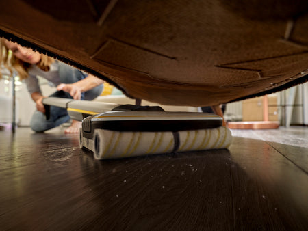 - Facile à manipuler : l'appareil ne nécessite pas de prise électrique. Il est maniable, nettoie jusqu'aux bords et passe sous les meubles bas grâce à son articulation flexible