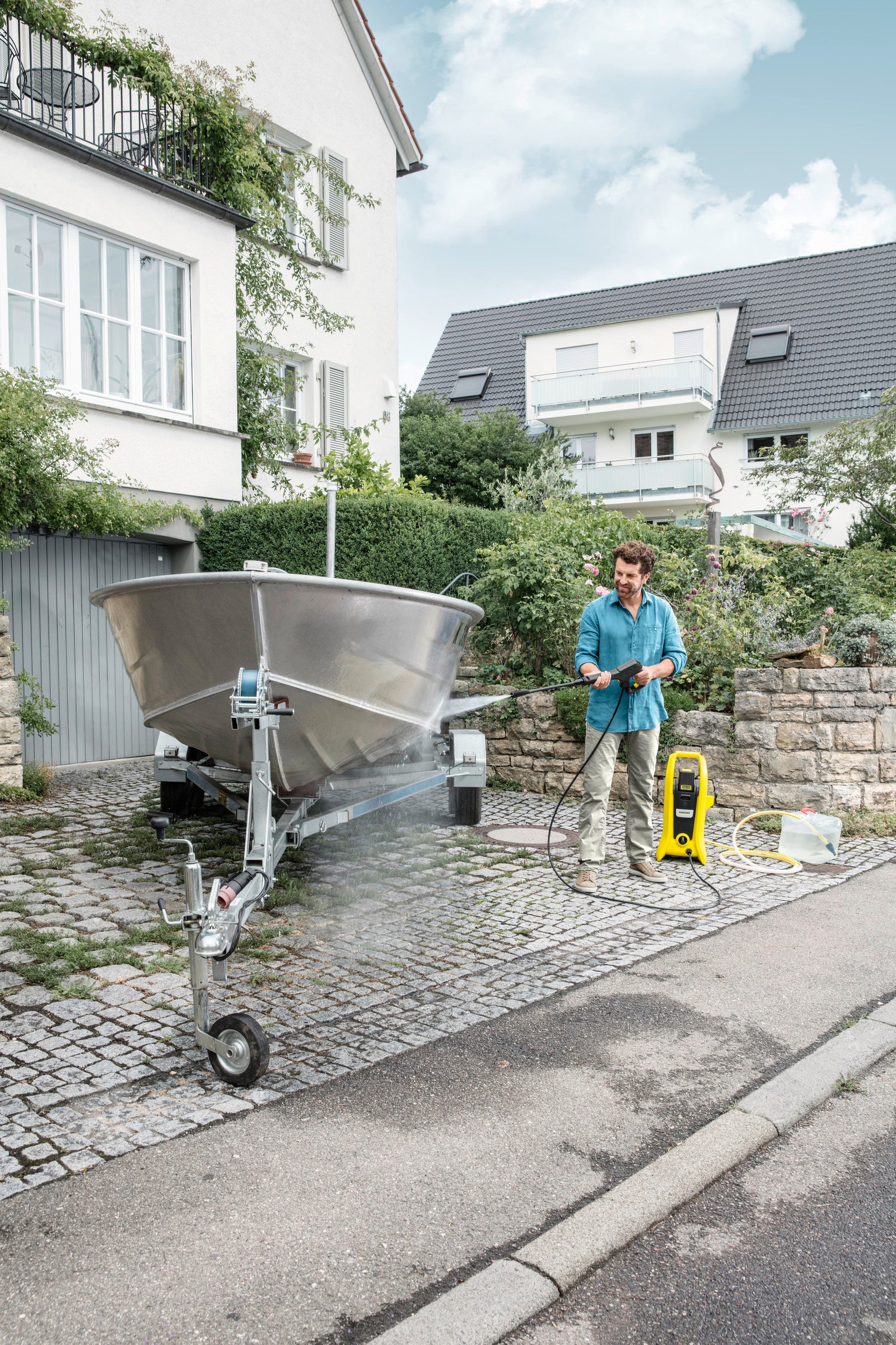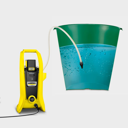 - Options de raccords multiples : le nettoyeur haute pression Kärcher peut être raccordé à l'eau via l'adaptateur A3/4" et un tuyau d'arrosage supplémentaire. Un tuyau d'aspiration est aussi disponible