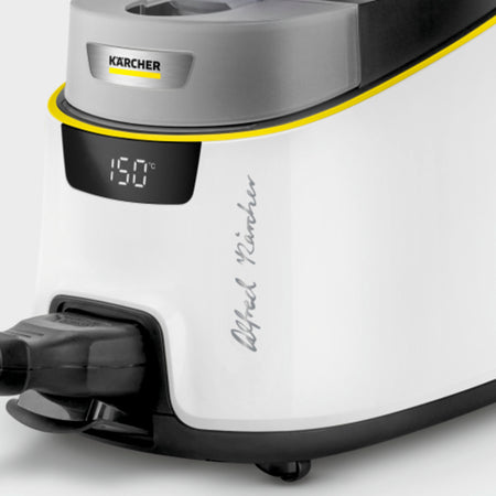 Le nettoyeur vapeur SC 5 Deluxe Signature Line de Kärcher assure une propreté impeccable grâce à une pression de vapeur de 4 bars. Il élimine en profondeur la saleté et les taches des surfaces dures uniquement avec de la vapeur chaude et même jusqu'à 99,999 % des virus* et des bactéries**. Pour dissoudre la saleté incrustée ou le calcaire, la fonction VapoHydro peut être activée : celle-ci permet d'envoyer de l'eau chaude sur la surface à nettoyer en plus de la vapeur. Le nettoyeur à vapeur ne met que 3 minutes à chauffer et peut être utilisé dès que la lumière LED s’affiche en vert. Pendant le temps de chauffe, l'écran permet de voir à quelle température se trouve la vapeur. Le SC 5 Deluxe Signature Line de Kärcher marque des points grâce à ses nombreux accessoires. Avec le set de nettoyage de sol EasyFix, le nettoyeur vapeur peut être utilisé sans problème pour le nettoyage des sols durs. Pour nettoyer les moquettes à la vapeur, il est possible de fixer un adaptateur. En plus du nettoyage des sols, le nettoyeur vapeur est également idéal pour les surfaces de la salle de bain, de la cuisine et du salon. Différentes buses et brosses peuvent être utilisées en fonction du domaine d'application et du degré de salissure. Le suceur à main recouvert d’une bonnette microfibres convient par exemple parfaitement au nettoyage des surfaces sensibles comme les plans de travail, les plaques de cuisson, les miroirs de carrelage ou les parois de douche. Pour les salissures tenaces dans les lieux étroits, la grande ou la petite brosse ronde, la brosse pour joints ainsi que la buse Turbo ou à jet rectiligne conviennent parfaitement. La livraison comprend le nettoyeur vapeur SC 5 Deluxe Signature Line de Kärcher, le set de nettoyage de sol EasyFix avec bonnettes microfibres, un adaptateur pour moquettes, un suceur à main, une buse Turbo et une buse à jet rectiligne, une grande et une petite brosse ronde, une brosse pour joints, une housse microfibres et du détartrant.
