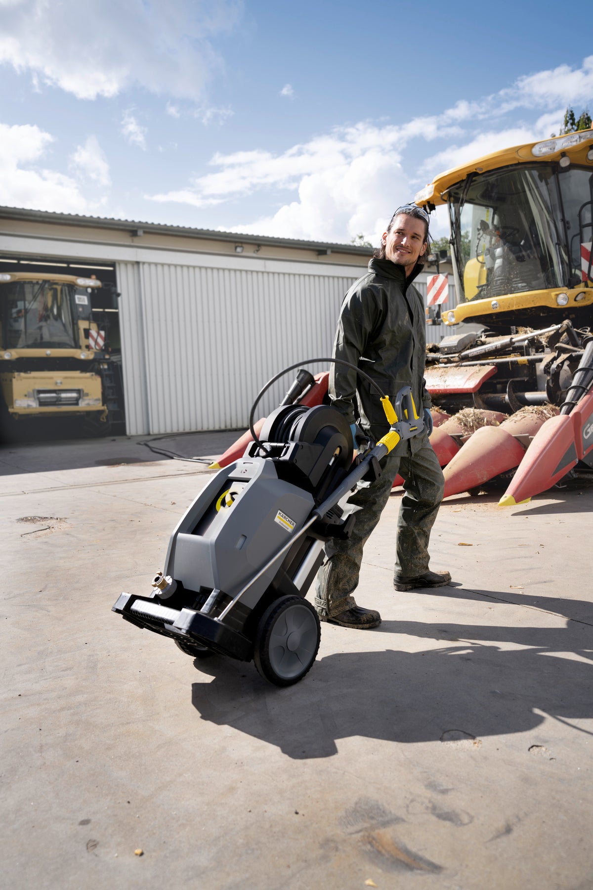 Le nettoyeur haute pression à eau froide HD 13/18-4 SXA Plus a été conçu pour répondre aux exigences les plus poussées en matière d'ergonomie et de qualité. Le pistolet haute pression EASY!Force Advanced réduit à zéro l'effort de maintien. La pression et la quantité d'eau peuvent être ajustées via le réglage Servo Control entre la lance et le pistolet. Ainsi, une réduction de la pression est possible pour les supports délicats, sans changement de buse ni réglage sur l'appareil. La buse rotative Vibrasoft atténue le bruit et les vibrations. Les systèmes d'assistance et l'indication de l'état à LED permettent de se repérer. Cet appareil de la gamme Super se distingue par sa finition irréprochable et ses matériaux haut de gamme. Au cœur de l'appareil se trouve une pompe à plateau oscillant robuste, dotée de pistons en acier inoxydable et d'une culasse en laiton. Le moteur à 4 pôles, à faible vitesse, refroidi à l'eau et à l'air, est durable et performant. Des entretoises de châssis en aluminium intégrées forment un châssis léger, adapté au chargement par grue. Le format debout avec le groupe moteur et l'unité de pompage verticaux garantit un design compact et mobile. En outre, l'équipement comprend un flexible haute pression Ultra Guard à revêtement en Teflon® et de nombreux rangements pour les accessoires ainsi qu'un enrouleur de flexible automatique pour l'enroulement et le déroulement jusqu'à 45°, même sous pression.