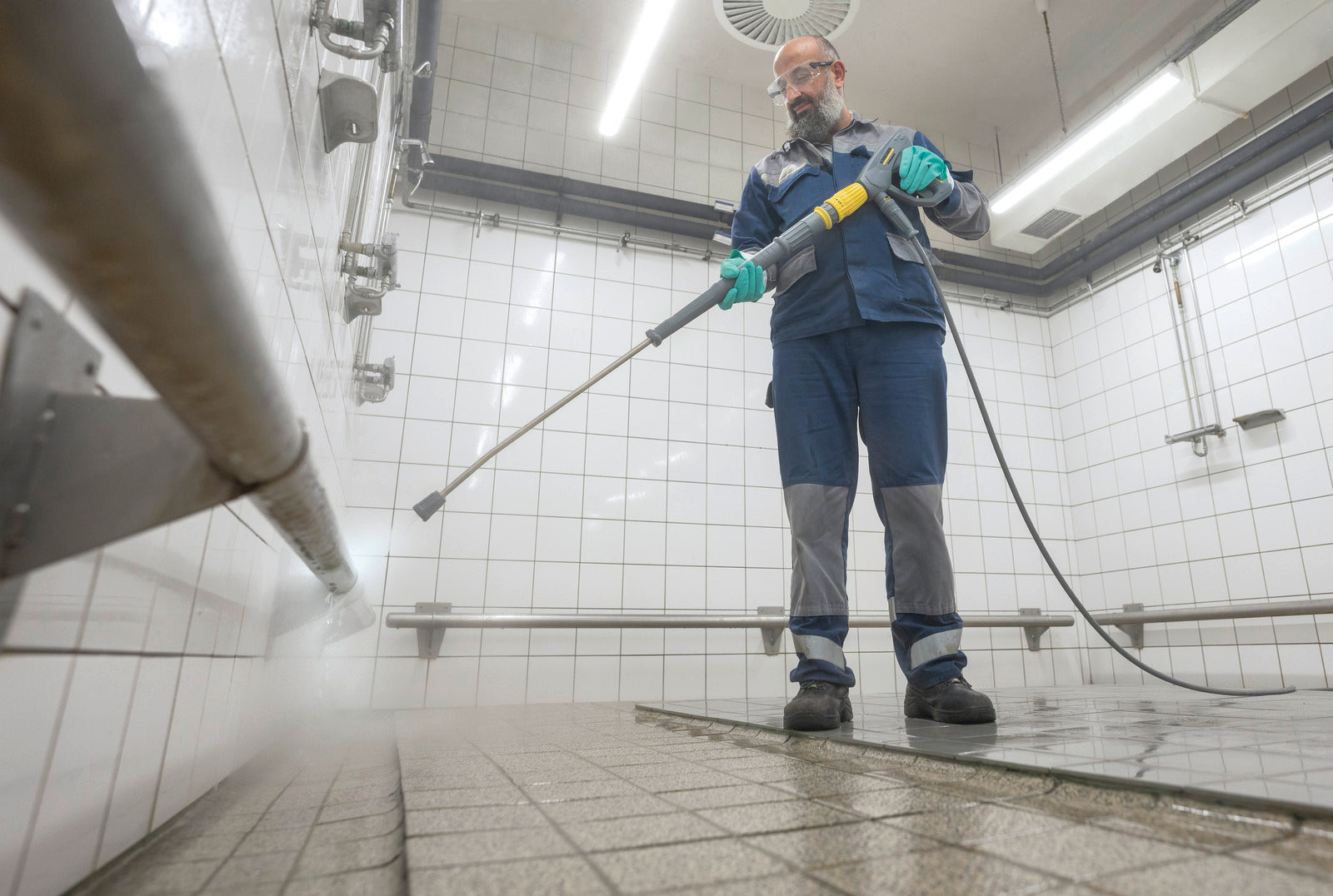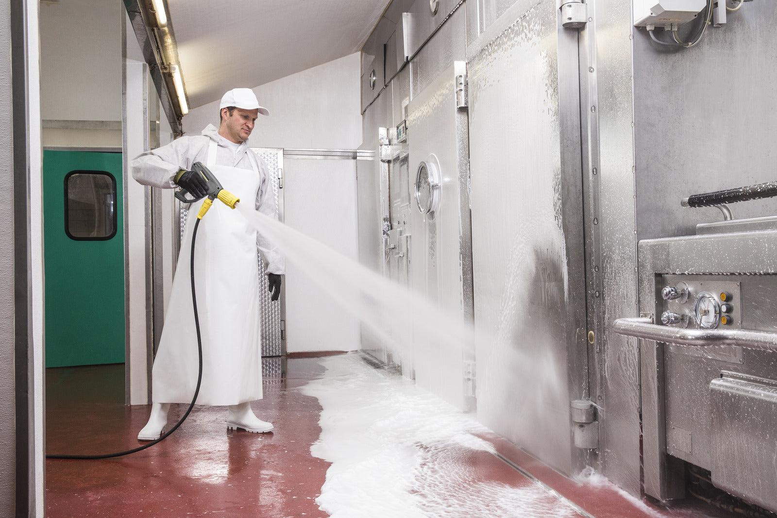 Avec 1 700 l/h et une pression de 120 bar, notre nettoyeur haute pression stationnaire à eau froide est performant et offre des conditions parfaites pour une utilisation continue en conditions de travail difficiles, par exemple dans l'industrie agroalimentaire. Une température d'arrivée d'eau maximale de 85 °C est possible. Aussi bien la pompe à vilebrequin avec culasse en laiton que le boîtier et le cadre en acier inoxydable garantissent la robustesse. Le nettoyeur haute pression comprend un réservoir de stockage d'eau avec sécurité manque d'eau et protection contre l'entartrage ; lorsque la protection contre l'entartrage est vide, cela est indiqué. Par ailleurs, du détergent peut être aspiré et dosé par le biais d'une vanne ; là aussi, un indicateur de réservoir vide est prévu. Le moteur électrique lent à 4 pôles garantit une longue durée de vie. Aussi bien l'installation que l'utilisation et la maintenance s'avèrent conviviales. Afin de garantir une sécurité élevée de l'exploitation, l'appareil est équipé d'une surveillance électronique. Le produit est complété par un vaste éventail d'accessoires qui peuvent être sélectionnés pour chaque point de prélèvement : manomètre, compteur d'heures, aspiration pour deuxième détergent, décompression automatique et télécommandes.