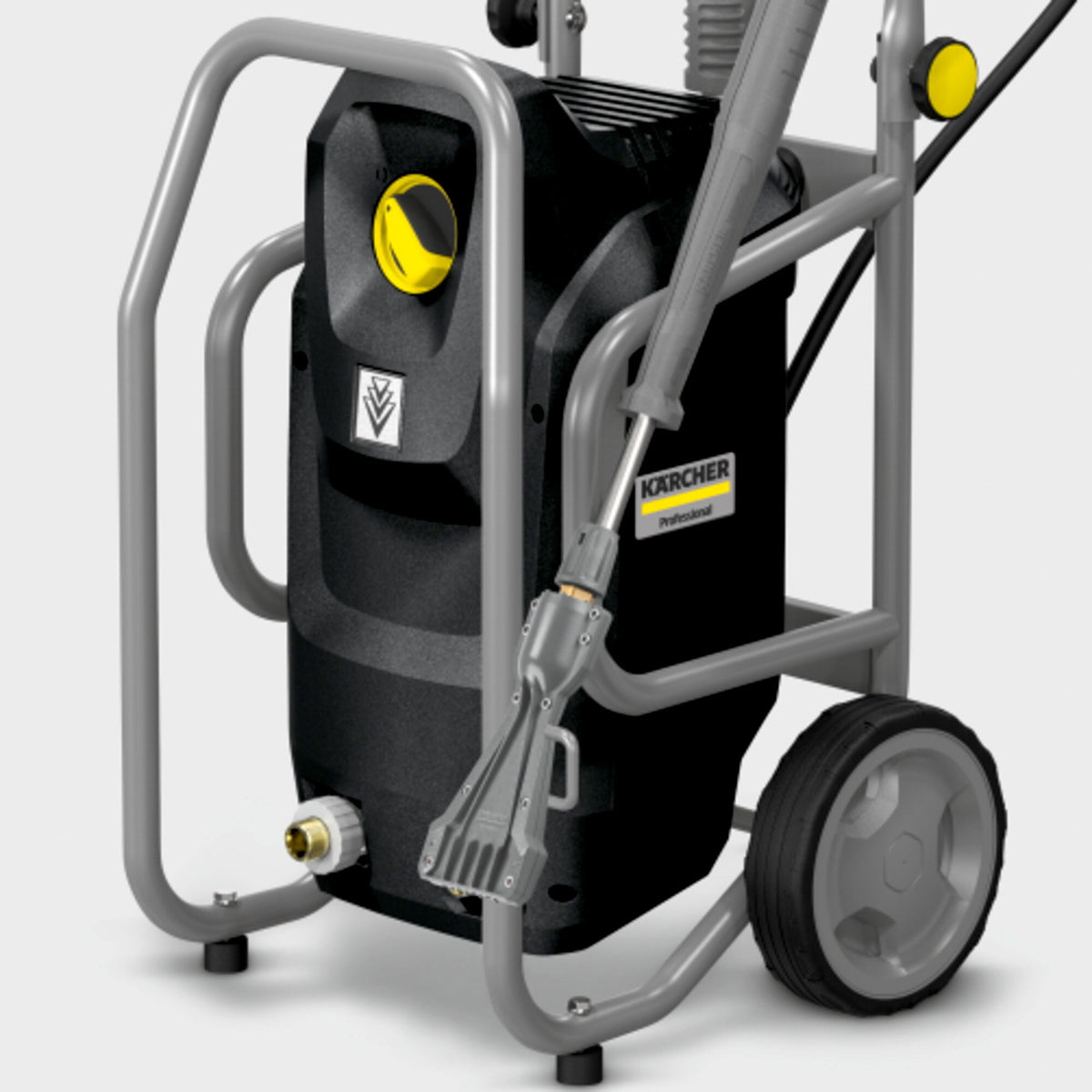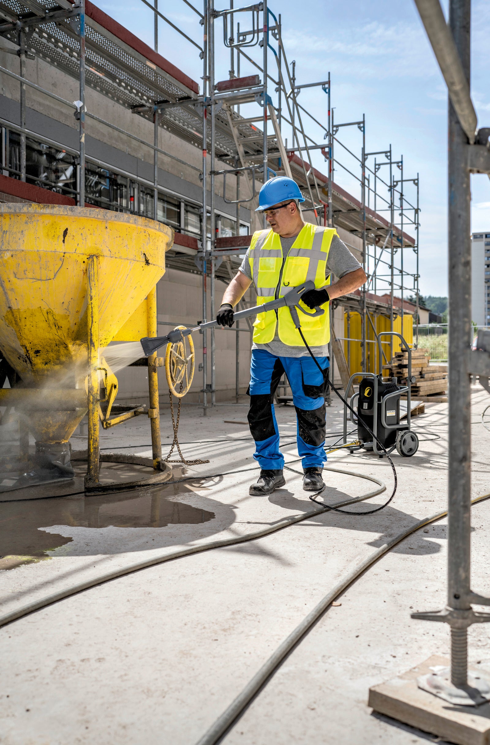 Kärcher fête ses 90 ans : le nettoyeur haute pression non chauffé HD 6/15 M Cage Anniversary Edition en noir est à la hauteur de toutes les situations dans les conditions rudes de l'utilisation professionnelle quotidienne, qu'il soit utilisé à la verticale ou à l'horizontale. L'appareil mobile, très robuste et fonctionnant sur courant triphasé est équipé d'une nouvelle pompe axiale à 3 pistons avec culasse en laiton permettant jusqu'à 20 % de puissance de nettoyage et d'efficacité énergétique en plus. Afin de protéger tous les composants haute pression, une décompression automatique est intégrée et pour la pompe en elle-même, un filtre à eau supplémentaire est installé. L'appareil possède une conception qui facilite grandement l'entretien et est équipé d'un cadre tubulaire en acier à revêtement par pulvérisation grâce auquel le nettoyeur haute pression résiste sans problèmes aux conditions les plus rudes. L'équipement de série comprend également notre pistolet haute pression EASY!Force innovant, qui s'appuie sur le recul du jet haute pression pour réduire à zéro l'effort de maintien, ainsi que les attaches rapides EASY!Lock pour une manipulation 5 fois plus rapide qu'avec les raccords classiques. La fourniture de l'édition anniversaire inclut une buse eco!Booster ainsi qu'une lance d'arrosage de 600 millimètres.