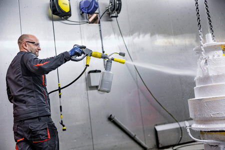 Notre nettoyeur haute pression à eau froide pour les conditions de travail difficiles en utilisation continue stationnaire peut être exploité avec une température de l'arrivée d'eau jusqu'à 60 °C. Avec une pression de 180 bar et un débit de 800 l/h, il est optimal pour le nettoyage de machines ou d'équipements de production. Son cœur est formé par la pompe à vilebrequin robuste avec culasse en laiton et le moteur électrique lent à 4 pôles. Le boîtier et le cadre qui sont fabriqués à partir d'acier revêtu par poudre contribuent également à la longévité. La machine comprend une aspiration pour détergent avec vanne de dosage et indicateur de réservoir vide ainsi qu'un réservoir de stockage d'eau avec sécurité manque d'eau ; là aussi, un indicateur le signale lorsque le réservoir est vide. Une exploitation sécurisée est garantie par la surveillance électronique avec signalement des erreurs et des intervalles de maintenance. Aussi bien l'utilisation à l'aide d'un grand bouton rotatif que l'installation et la maintenance s'effectuent confortablement et aisément. Le vaste éventail d'accessoires, par ex. un compteur d'heures, des télécommandes ou une décompression automatique, n'est pas inclus et peut être sélectionné pour chaque point de prélèvement.