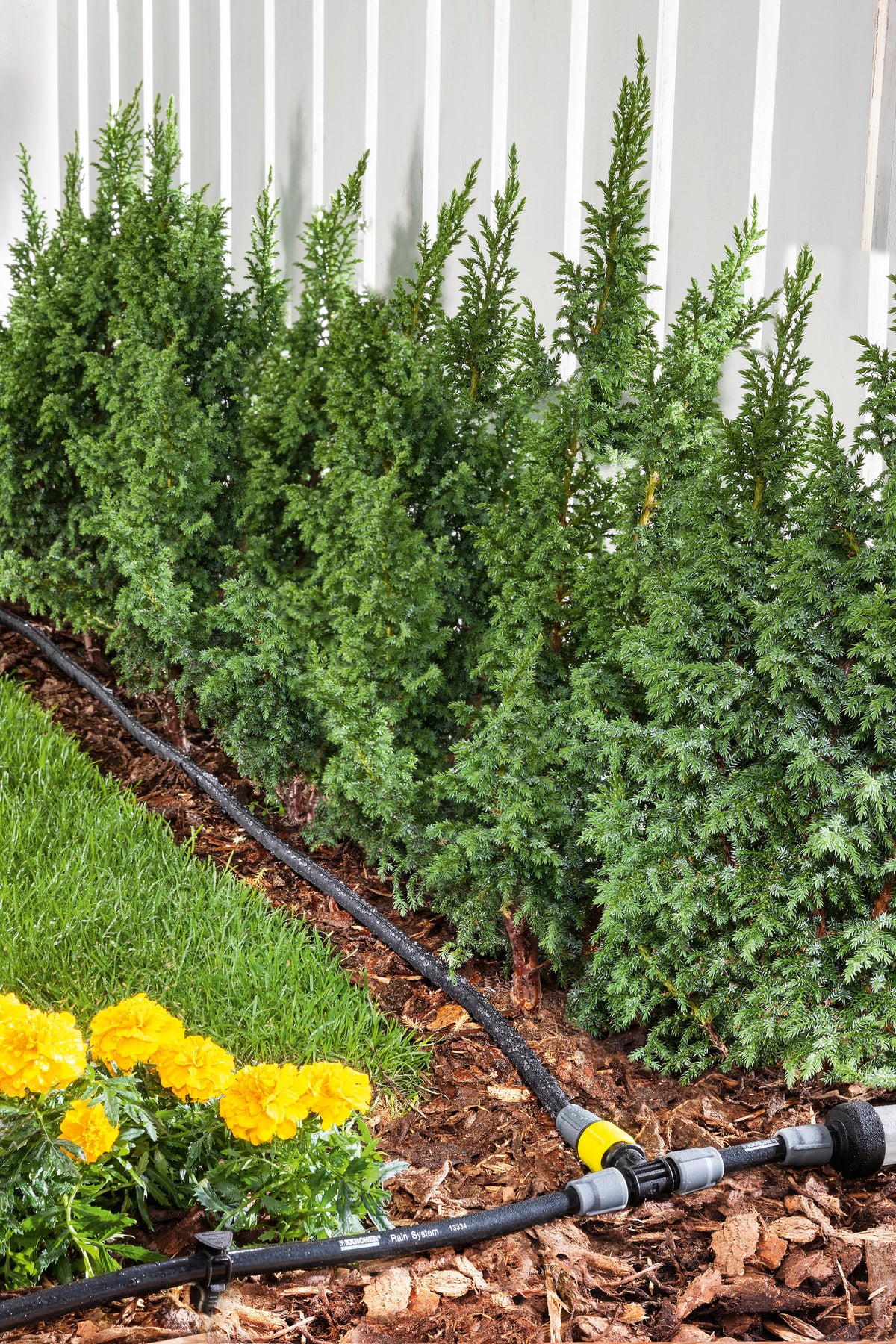 L'embout en T avec régulateur fait partie du Kärcher Rain System®. Il raccorde trois flexibles Kärcher Rain System® ou flexibles microporeux l'un à l'autre et permet la mise en place de deux lignes de flexibles indépendants. Cela permet d'adapter le système parfaitement aux besoins individuels. L'embout en T permet un débit réglable et par conséquent un réglage de la pression en convient parfaitement au raccordement du flexible microporeux. Le tuyau peut être installé facilement sans besoin d'outils. Le flexible est poussé tout simplement sur l'embout en T et fixé à l'aide d'un écrou de raccordement. Le système très efficace Kärcher Rain System® combine les avantages d'un arrosage goutte-à-goutte à l'arrosage traditionnel, il travaille à une pression jusqu'à 4 bars et est équipé d'un tuyau 1/2" avec des manchons goutte-à-goutte et de pulvérisation. Le Kärcher Rain System® peut êtreadapté de façon individuelle à presque tous les types de jardins et fonctionne parfaitement ensemble avec le SensoTimer pour un contrôle de l'eau répondant aux besoins.