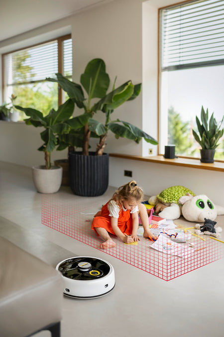 - Navigation : le capteur laser LiDAR scanne les zones à nettoyer dans l'application. La détection des tapis et les capteurs de chute assurent une navigation sûre