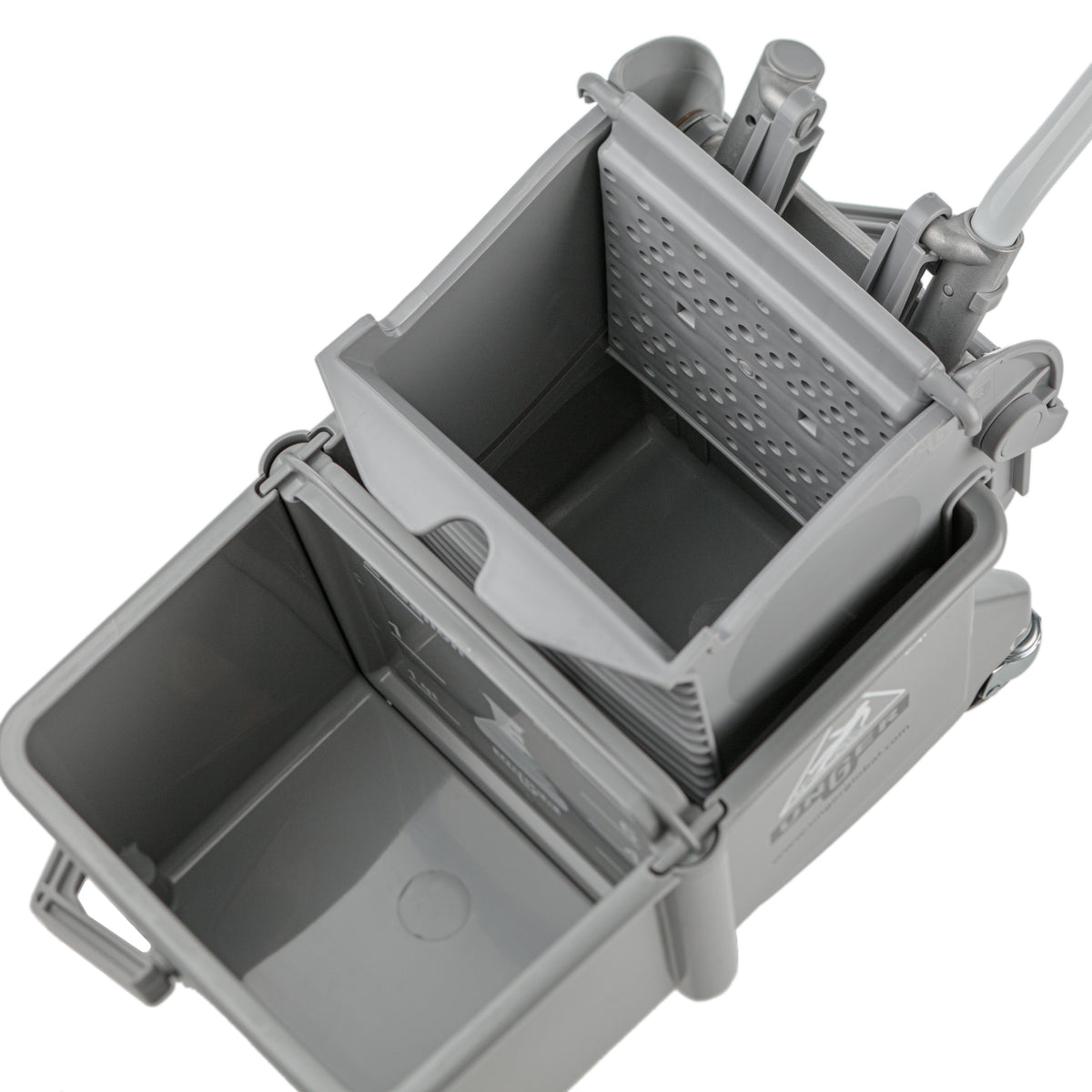 Double seau à roulettes complet avec dispositif d’éssorage.