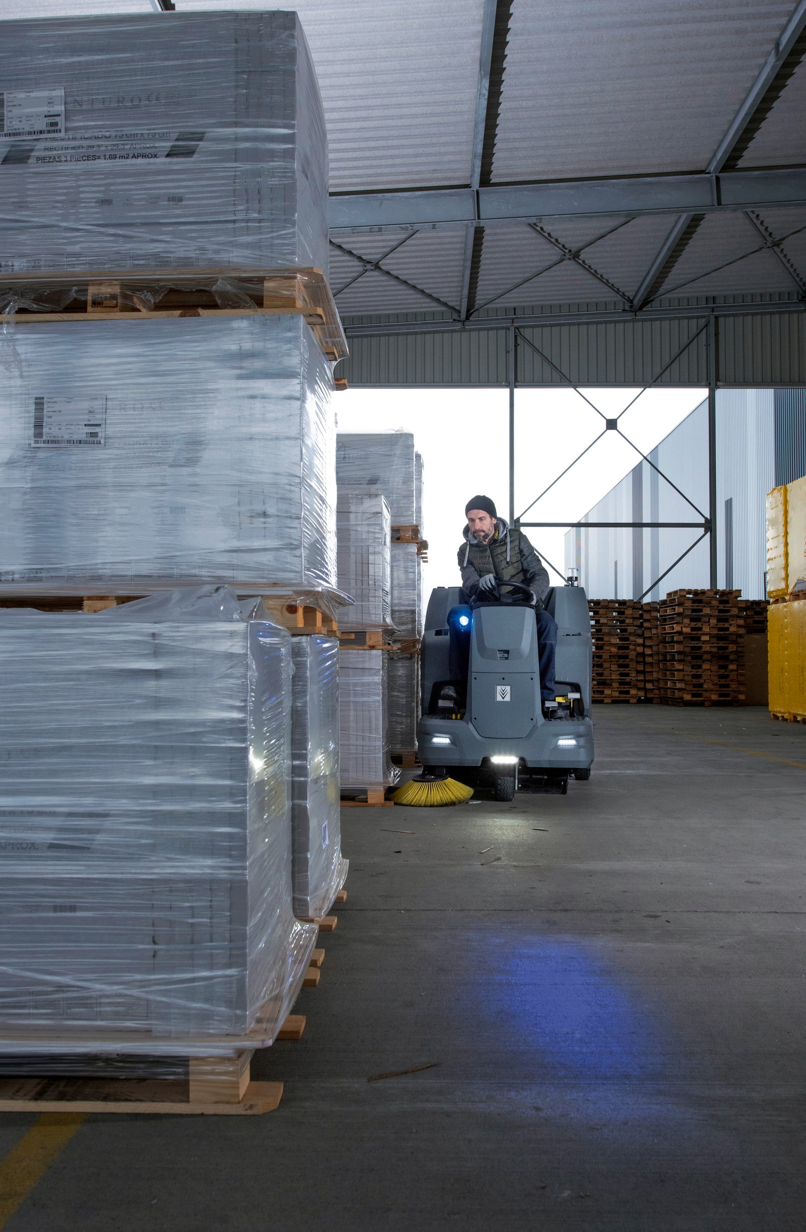 Notamment dans les lieux très fréquentés et les environnements bruyants, le Spotlight bleu pour notre balayeuse aspirante KM 100/120 R garantit une visibilité optimale de la machine. L'avertisseur de trajectoire optique projette un point lumineux bleu sur le sol devant la machine, attirant ainsi l'attention des piétons et des autres véhicules sur le croisement de la balayeuse, ce qui contribue directement à un niveau de sécurité maximal pour l'utilisateur et la machine.