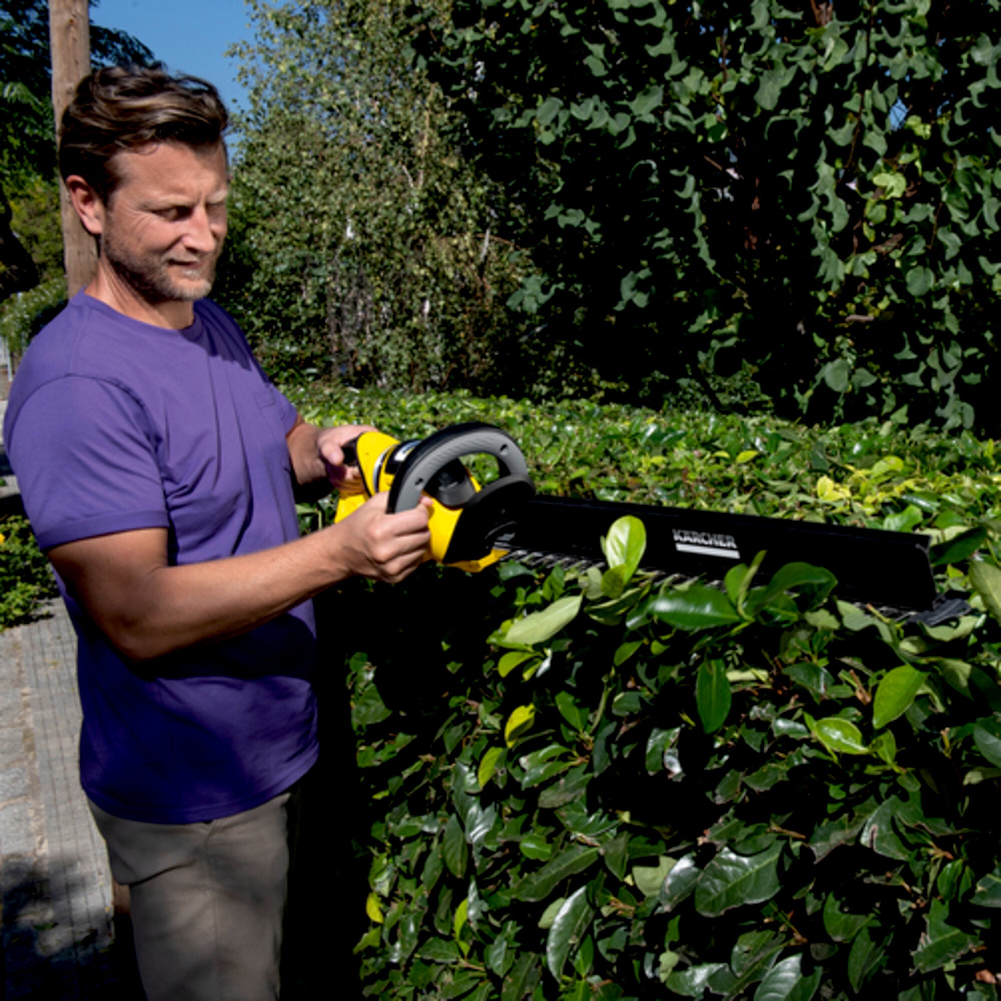 Le taille-haie sans fil 36 V HGE 36-60 Battery Set de Kärcher est un concentré absolu de puissance. Grâce au réglage de la vitesse à 2 niveaux, il est possible de choisir entre vitesse maximale et puissance maximale en fonction de l'application. La poignée peut être orientée sur 180° en plusieurs paliers, garantissant ainsi un travail confortable dans toutes les positions, et ce sans aucune fatigue des bras ou des épaules, par exemple lors des coupes verticales. Particulièrement pratique : le collecteur de déchets amovible. Ce dernier empêche les déchets de coupe de tomber dans la haie et les amène confortablement par terre. La lame découpée au laser et affûtée au diamant produit un résultat de coupe très précis. La protection supplémentaire de la pointe de lame évite d'endommager les bâtiments et les sols ainsi que la lame en elle-même et l'œillet de suspension intégré garantit un rangement peu encombrant sur le mur. La fonction de scie permet aussi de tailler aisément les grosses branches. Une batterie et un chargeur rapide sont inclus.