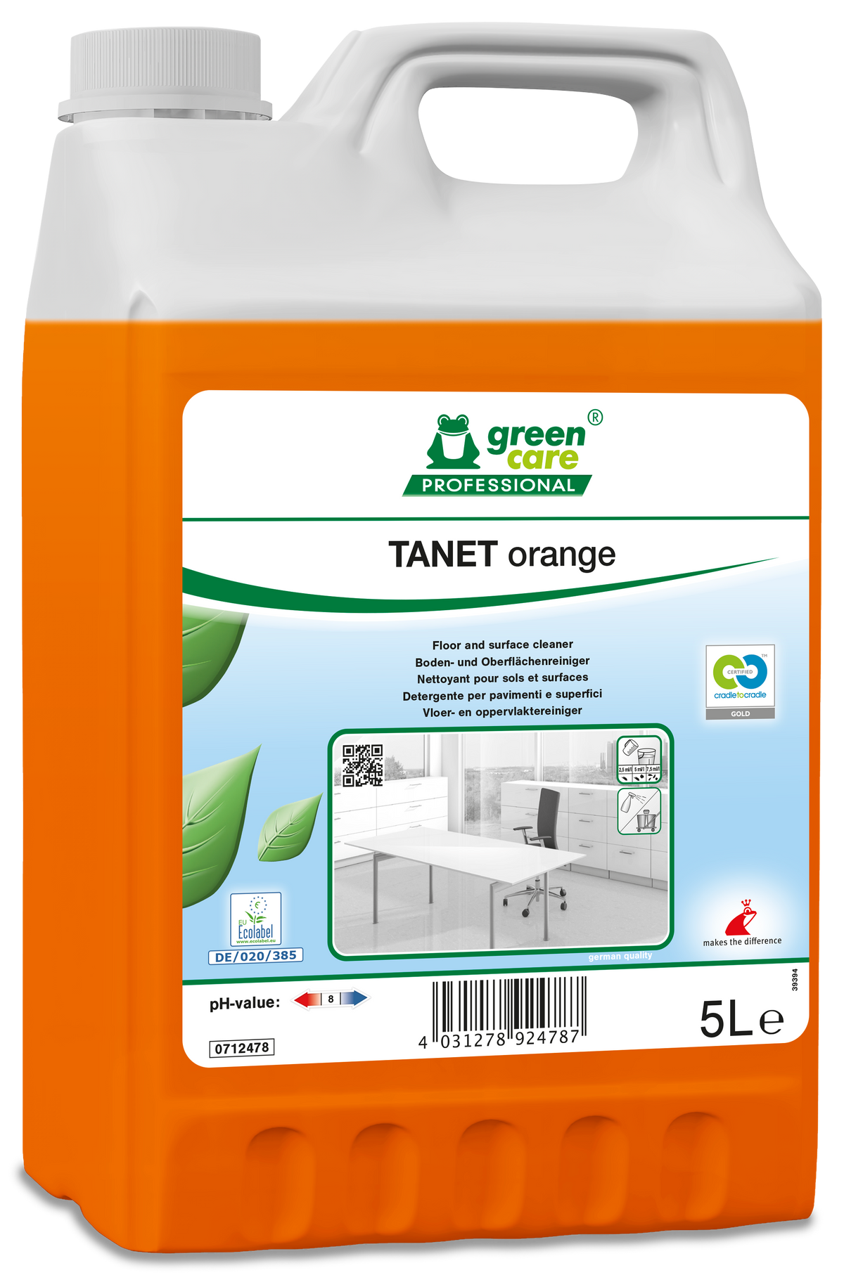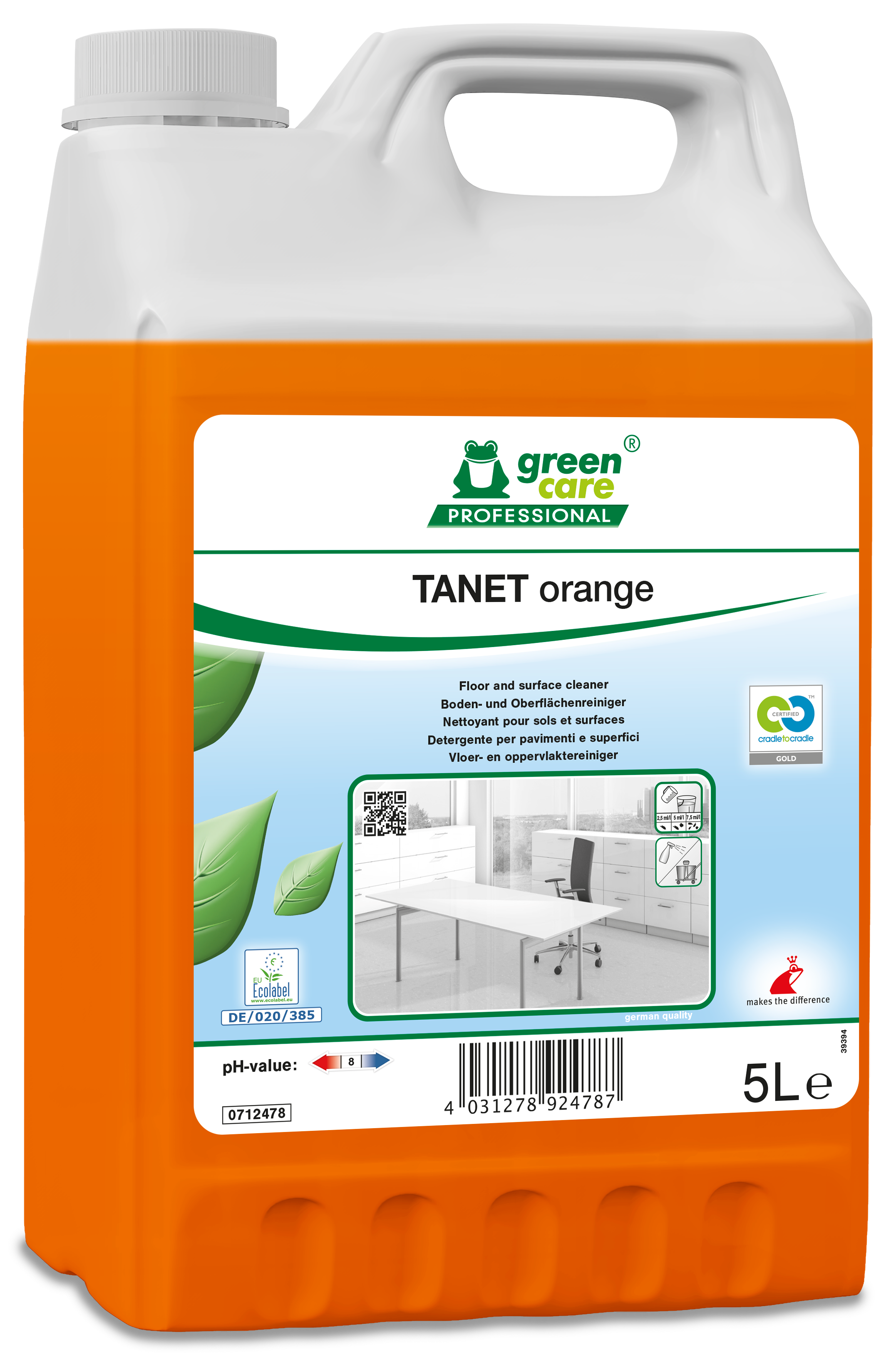 • TANET orange est un nettoyant sols et surfaces, aux propriétés environnementales remarquables et à l’agréable parfum agréable d’orange. TANET orange est vertueux pour l’environnement et l’utilisateur, car il respecte les cycles des éco-systèmes.