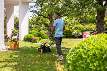 Avec 2 batteries de 18 volts et un puissant moteur de 36 volts sans balais, la LMO 5-18 Dual Battery Set est aussi à l'aise sur les grandes pelouses jusqu'à 550 mètres carrés. Légère et maniable, cette tondeuse à batterie offre une bonne manœuvrabilité, même en terrain accidenté ou pour contourner des obstacles. La largeur de travail est de 41 centimètres ; la hauteur de coupe peut être ajustée sur 6 niveaux entre 25 et 70 millimètres. Pendant la tonte, la commande intelligente du moteur iPower ajuste automatiquement le régime à l'état de l'herbe. Le long des bordures ou des arêtes, les guide-herbes redressent les brins d'herbe pour une saisie optimale. Le système de tonte 2 en 1 permet de répartir l'herbe coupée uniformément sur la pelouse comme engrais naturel pendant le paillage ou de la collecter dans le bac de ramassage d'une capacité de 45 litres – pour une session de tonte prolongée sans interruption. Le guidon est télescopique pour garantir une posture de travail agréable et ergonomique. La tringlerie pliable permet un rangement à encombrement minimal. Le transport facile dans les escaliers et sur les paliers est assuré par une grande poignée de transport robuste. Les batteries et un chargeur rapide sont inclus dans le kit.