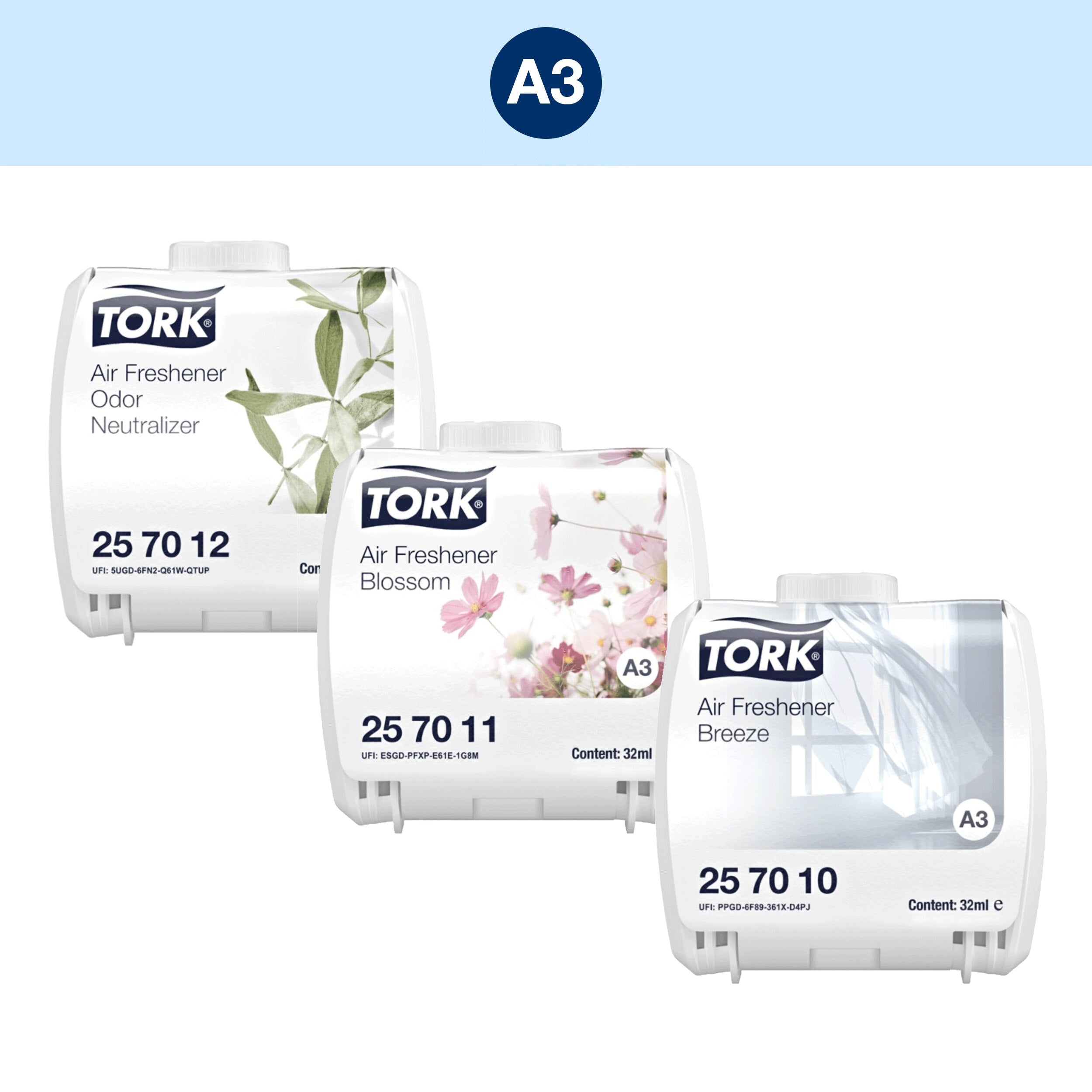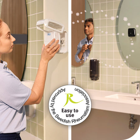 Éliminez les odeurs dans vos sanitaires grâce au distributeur de désodorisant en continu Tork. Sa technologie* unique diffuse durablement un parfum agréable sans effet de pulvérisation. L’intensité est réglable. Le distributeur peut se placer plus bas que les systèmes d'aérosols traditionnels. Certifié sans effort par l'Association suédoise de rhumatologie, il simplifie rechargements et entretien. *Technologie brevetée et éprouvée utilisée dans l'industrie pharmaceutique.