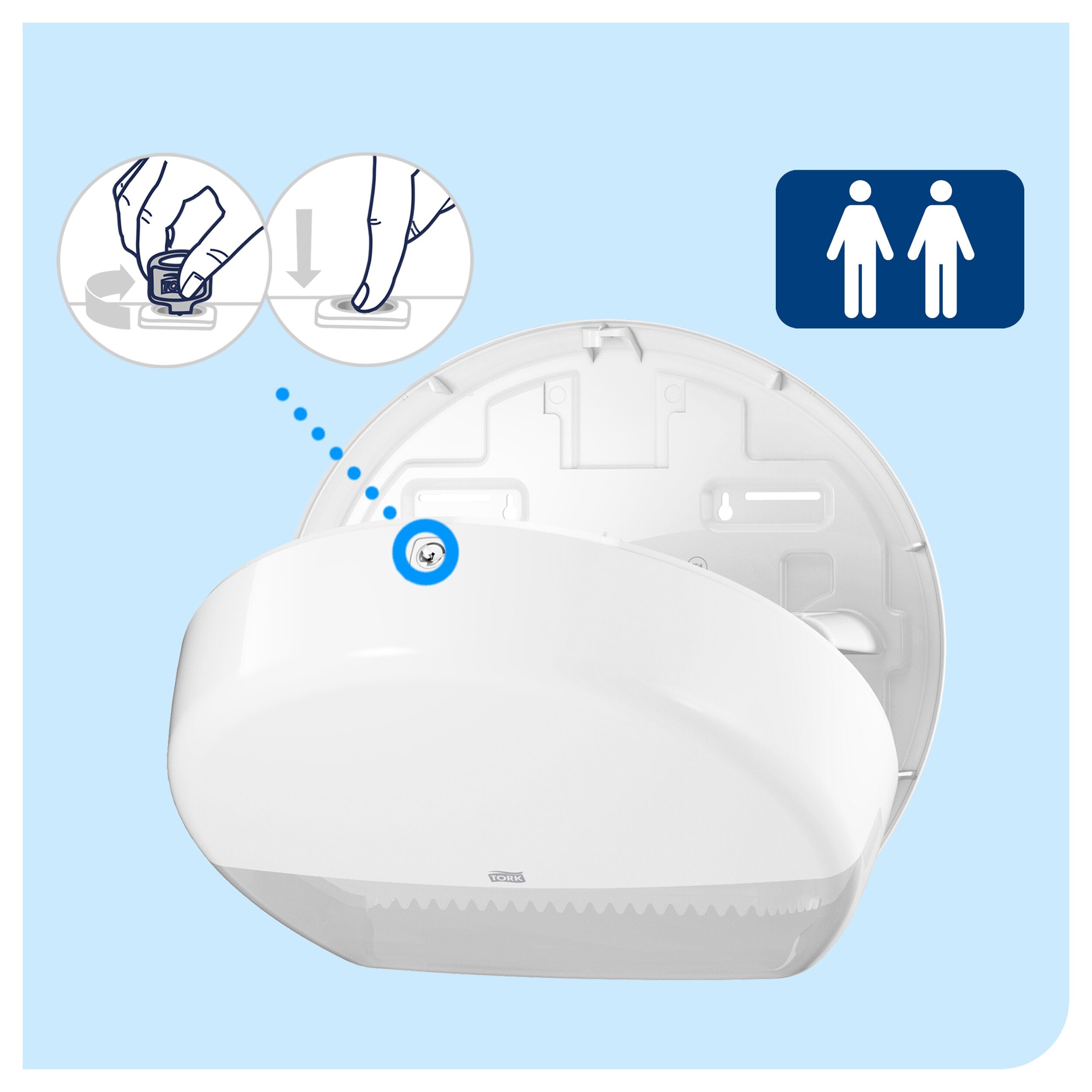 Tork Distributeur pour Papier Toilette Rouleau Mini Jumbo blanc T2 : Gagnez du temps et faites des économies grâce au Distributeur pour Papier Toilette Rouleau Mini Jumbo Tork. Idéal pour les sanitaires à fréquentation moyenne à élevée, il exige moins de rechargements grâce à sa grande capacité. Un frein pour rouleau optimal empêche le déroulement ininterrompu des rouleaux afin de réduire la consommation, tandis qu'une fonctionnalité intelligente permet d’utiliser la totalité du rouleau afin de réduire le gaspillage. La conception fermée de ce distributeur moderne protège les rouleaux, préserve l'hygiène des sanitaires et fait bonne impression sur les clients.