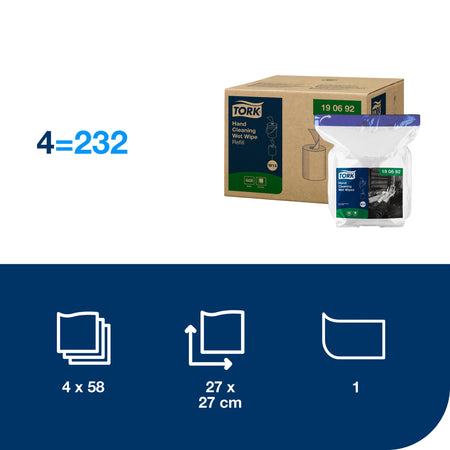 En l'absence d'eau à proximité, comptez sur nos Lingettes humides pour Nettoyage des mains Tork. Leur structure résistante vous permet d'éliminer rapidement huile, graisse et lubrifiants. Grâce à leur qualité professionnelle, vous pouvez nettoyer la saleté efficacement. Nos lingettes premium 1 pli sans parfum présentent une formule douce pour les mains. Le rechargement est également simplifié : les lingettes utilisées avec notre seau vous facilitent la tâche.