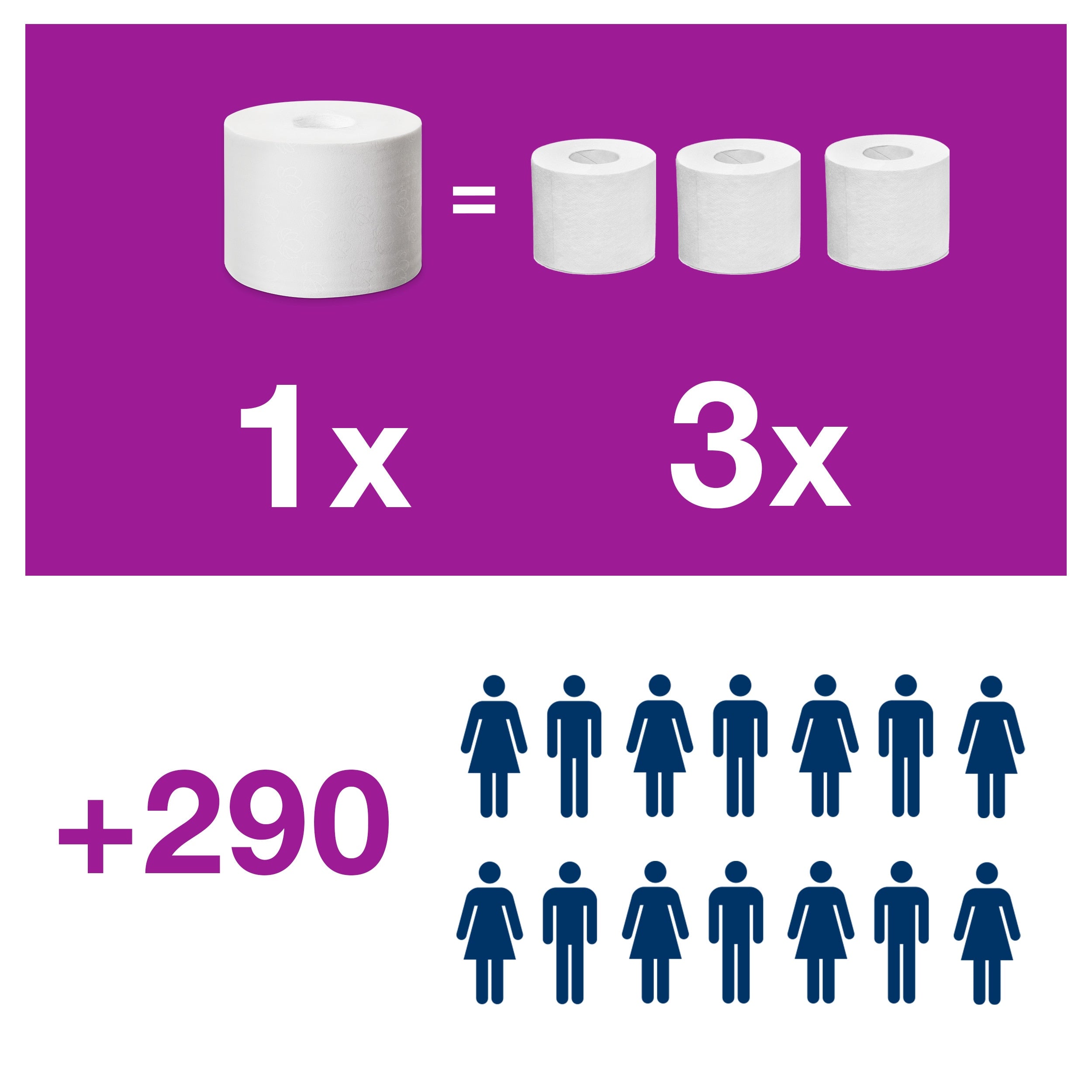 Tork OptiServe® sans mandrin est un système de papier toilette sans mandrin grande capacité destiné aux installations qui mettent l'accent sur l'efficacité, la durabilité et une excellente expérience. Grâce à sa grande capacité, un espace de stockage réduit et une conception certifiée facile d'utilisation, c'est la meilleure alternative au papier hygiénique traditionnel et aux rouleaux de papier toilette jumbo. Ce distributeur fait partie d'une large gamme destinée à répondre à différents besoins en matière de sanitaires, afin que les mêmes consommables compacts puissent être utilisés dans tout l'établissement. Par rapport au papier toilette traditionnel, le papier toilette rouleau sans mandrin Tork OptiServe® contient 3 fois plus de papier. Sans mandrin et sans emballage, il produit moins de déchets.