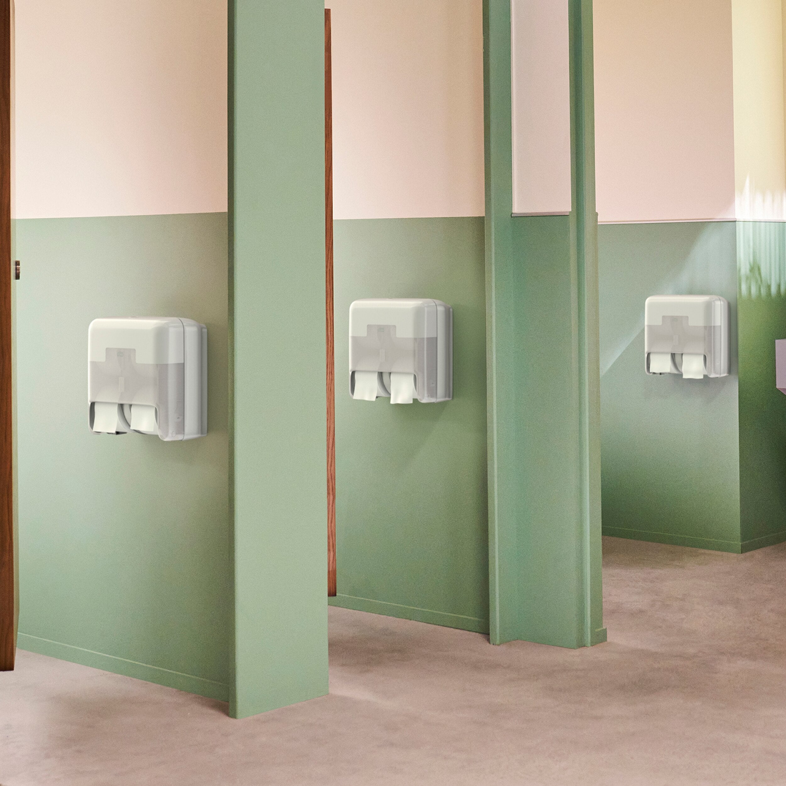 Tork OptiServe® sans mandrin est un système de papier toilette sans mandrin grande capacité destiné aux installations qui mettent l'accent sur l'efficacité, la durabilité et une excellente expérience. Grâce à sa grande capacité, un espace de stockage réduit et une conception certifiée facile d'utilisation, c'est la meilleure alternative au papier hygiénique traditionnel et aux rouleaux de papier toilette jumbo. Ce distributeur fait partie d'une large gamme destinée à répondre à différents besoins en matière de sanitaires, afin que les mêmes consommables compacts puissent être utilisés dans tout l'établissement. Par rapport au papier toilette traditionnel, le papier toilette rouleau sans mandrin Tork OptiServe® contient 3 fois plus de papier. Sans mandrin et sans emballage, il produit moins de déchets.
