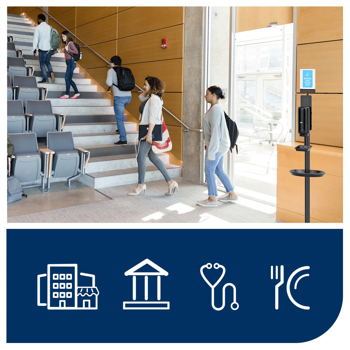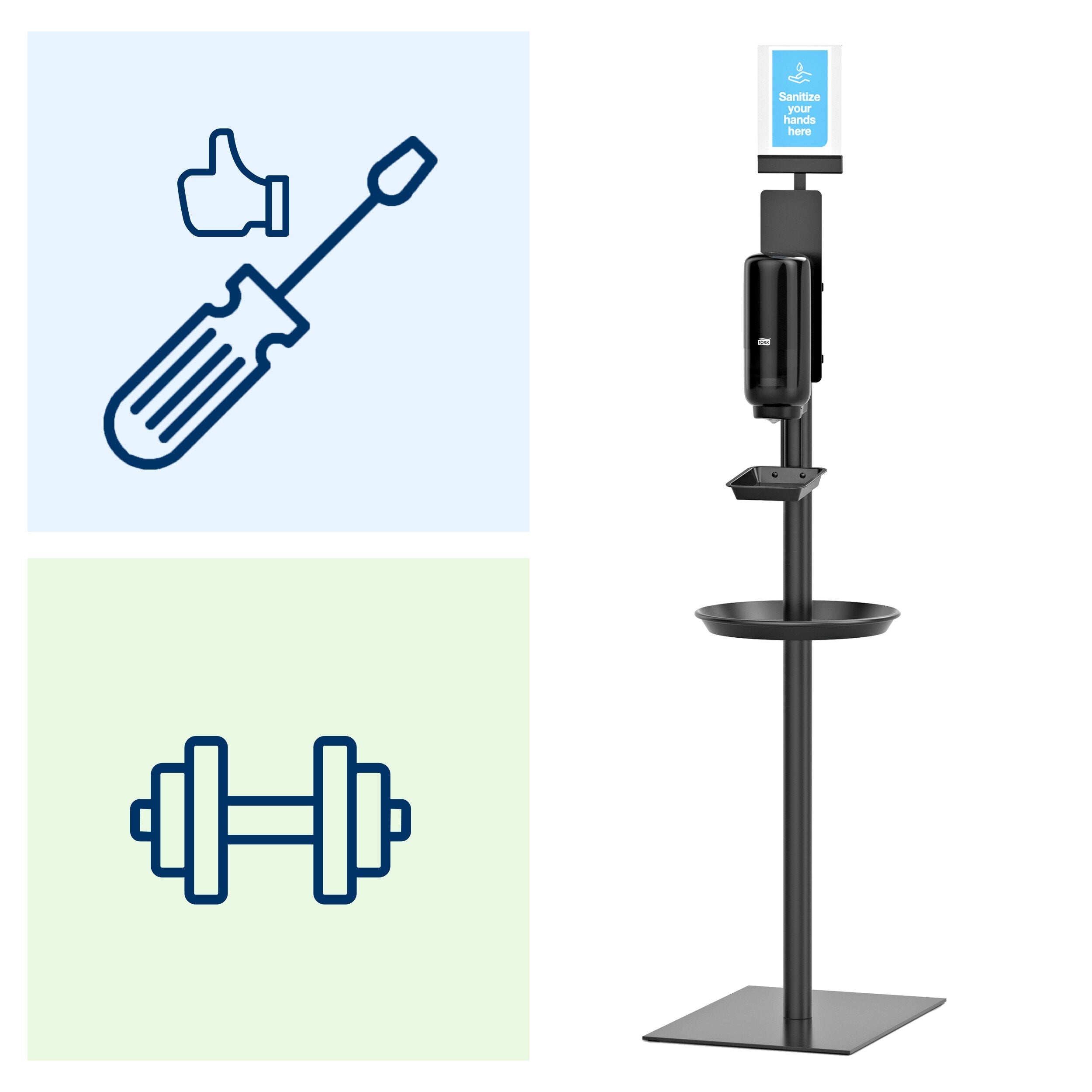 Communiquez efficacement avec les clients et les employés avec le panneau AD-A-Glance® Tork. Il s'emboîte parfaitement au-dessus des Stands de désinfection des mains Tork. Ce panneau entièrement personnalisable permet de partager des rappels utiles concernant l'hygiène des mains, des informations essentielles sur la santé et la sécurité ou des publicités pour vos produits. Accédez à l'outil en ligne Tork, qui offre des messages préconfigurés pour vous faire gagner du temps.