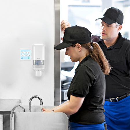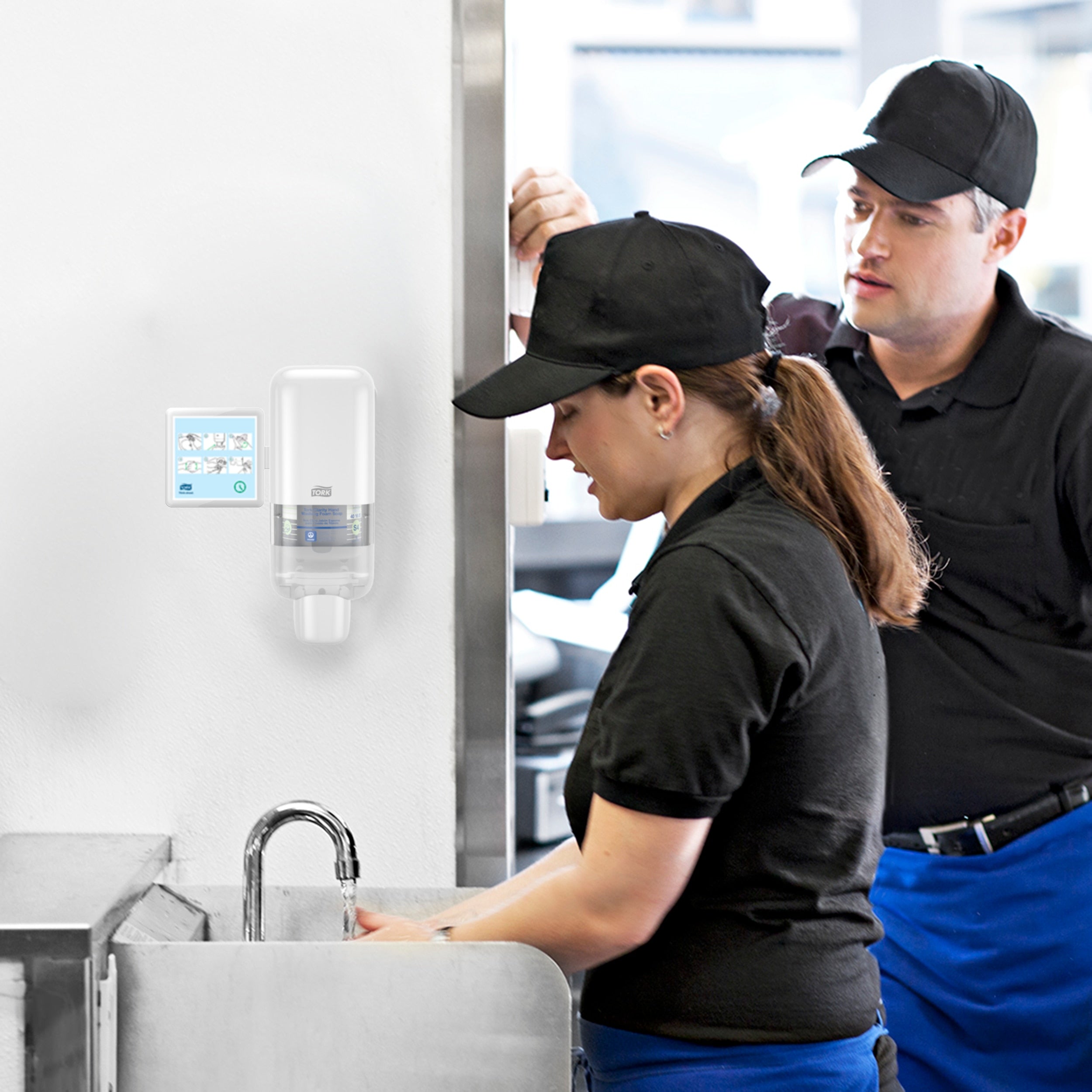 Le Panneau d'affichage pour distributeur de savon et de désinfectant Tork est un outil de communication qui favorise une bonne hygiène des mains. Disponible en noir et en blanc de façon à s'accorder avec vos distributeurs Tork, c'est un moyen idéal pour rappeler aux utilisateurs l'importance du lavage des mains, leur indiquer quel consommable est utilisé, les informer sur la façon correcte de se laver les mains ou faire passer d'autres messages pertinents.