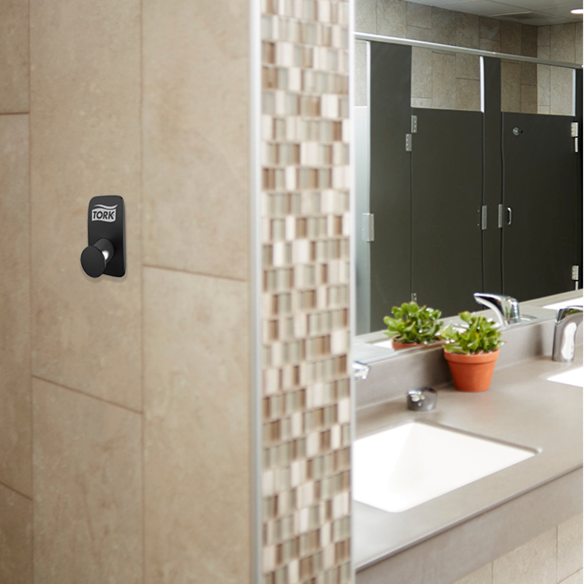 Permettez à vos clients de garder leurs sacs et leurs manteaux propres grâce à notre patère Tork fonctionnelle. Moderne, elle présente une surface lisse et des lignes épurées qui s'intègrent aux sanitaires contemporains. Elle est coordonnée à notre gamme Image Design. L'acier inoxydable élégant fait bonne impression auprès des clients, tandis que le revêtement anti-traces de doigts lui donne un aspect propre plus longtemps. Le montage facile sans vis apparentes offre une finition de qualité, simplement et rapidement.