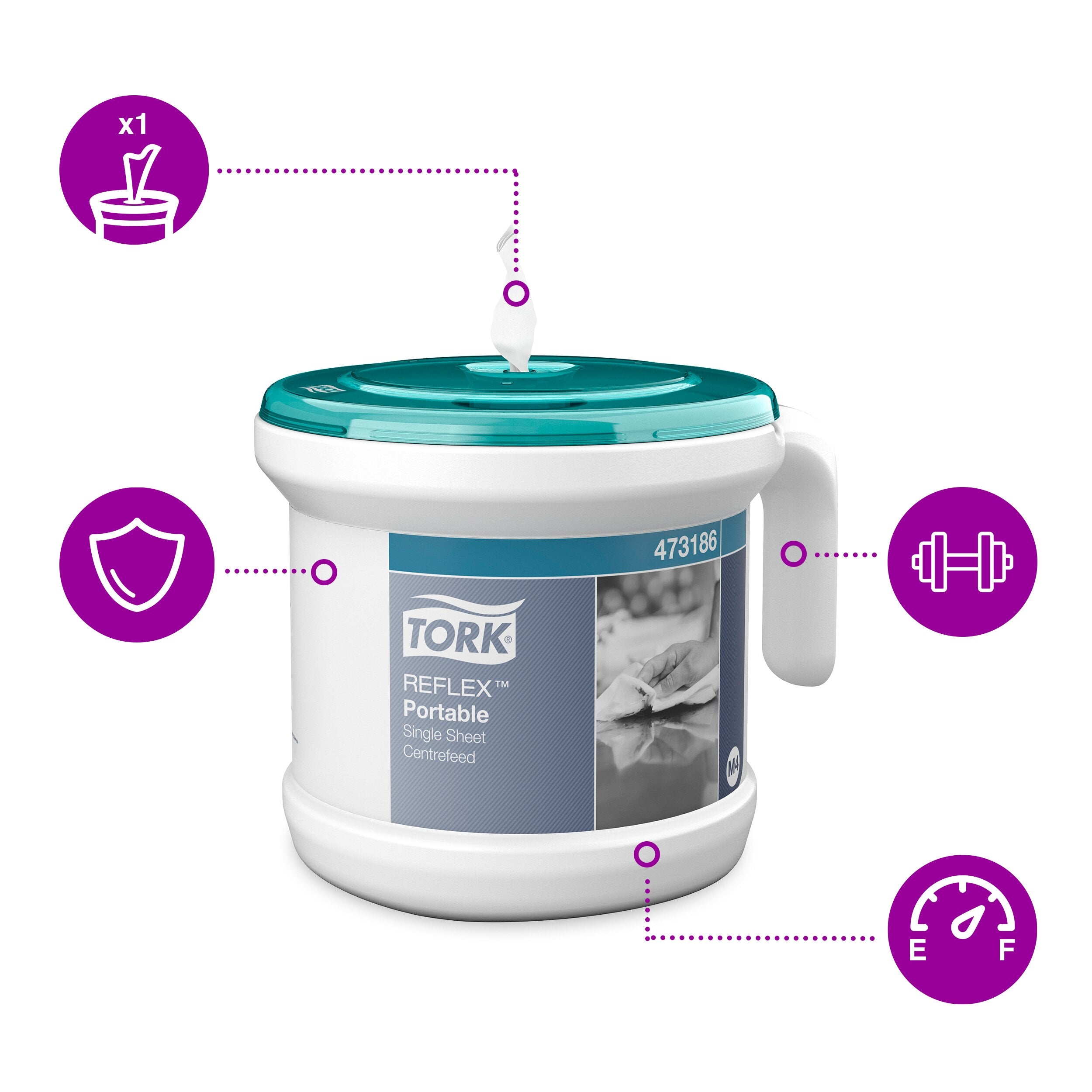 Portable, notre Distributeur à Dévidage Central Tork Reflex™ permet d'essuyer les mains et les surfaces tout en vous déplaçant. Solide et hygiénique, il convient idéalement aux secteurs de l'hôtellerie, du nettoyage et aux postes itinérants. Sa poignée polyvalente facilite le transport et permet de le fixer à un chariot. La distribution feuille à feuille limite le gaspillage et réduit la consommation jusqu'à 37 % par rapport au Distributeur à Dévidage Central Tork.